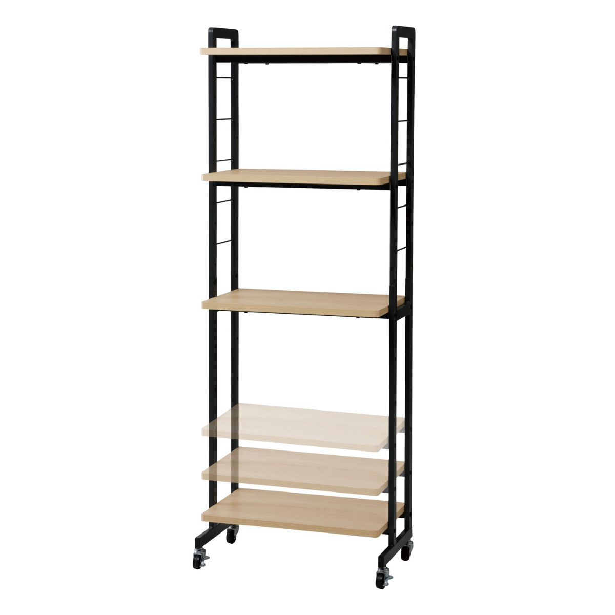 シンプルな機能をそのまま形にしたモダンなファニチャーシリーズ「ヴァンナ」。落ち着いた木目調天板とブラックのスリムフレームで、圧迫感のない洗練されたデザインのキャスター付きラックです。