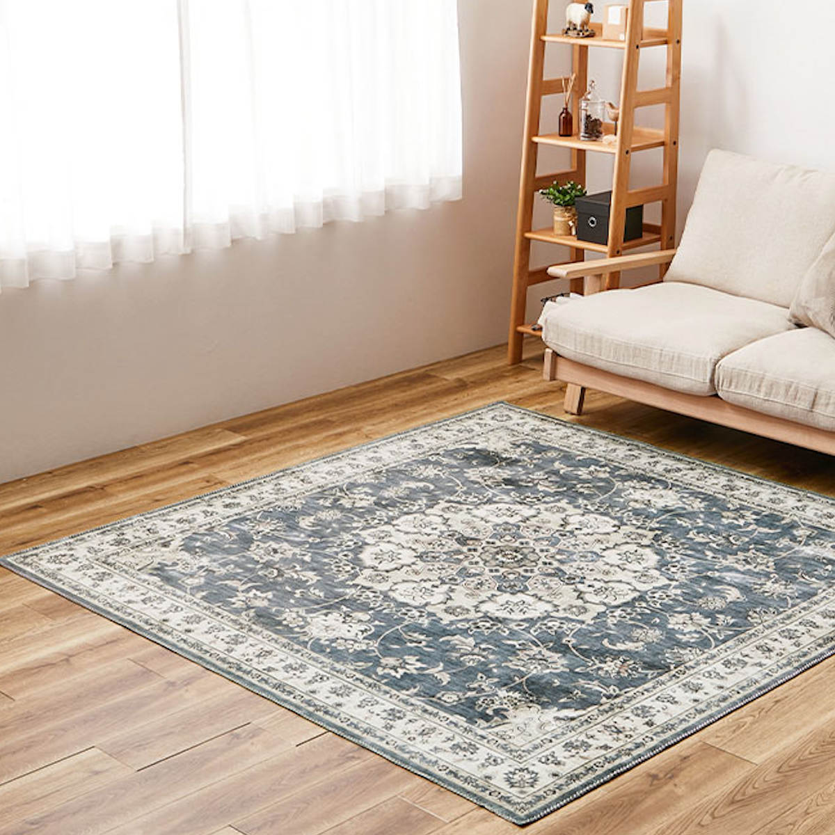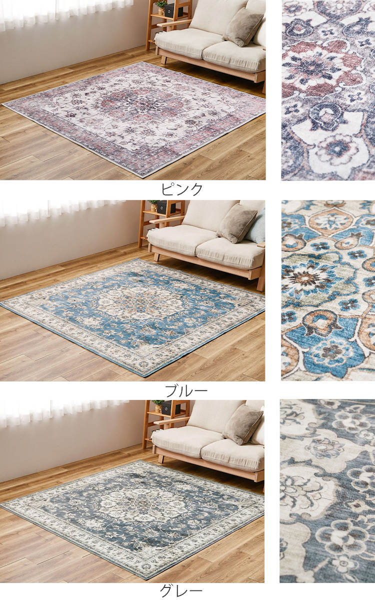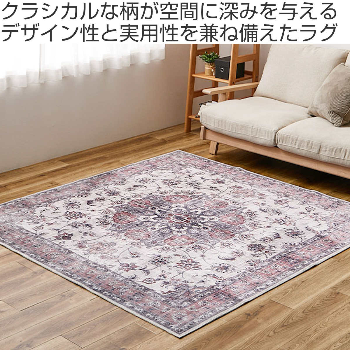 ペルシャ絨毯のクラシックなメダリオン柄と、かすれた風合いを忠実に再現したデザインラグです。リビングなどの中心に敷きやすい正方形サイズです。存在感のあるデザインながら、プリントラグならではの扱いやすさで日常使いに最適です。