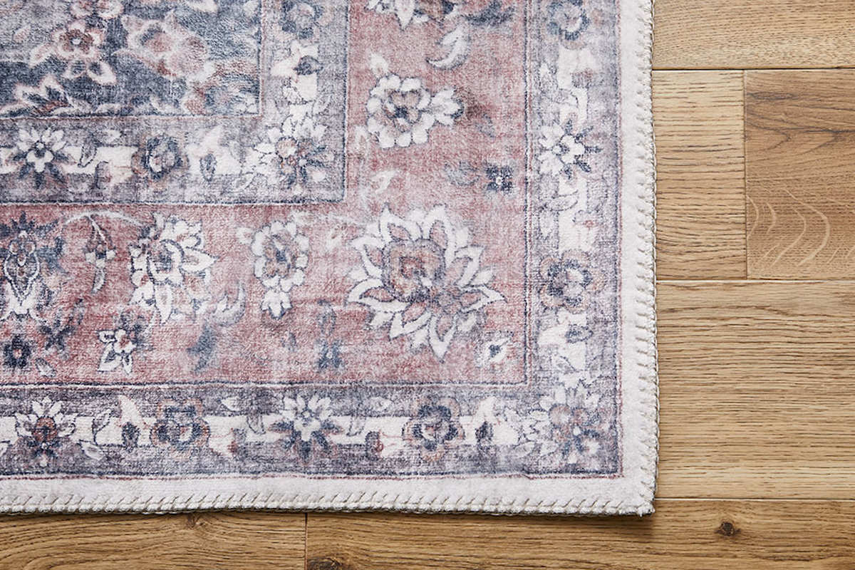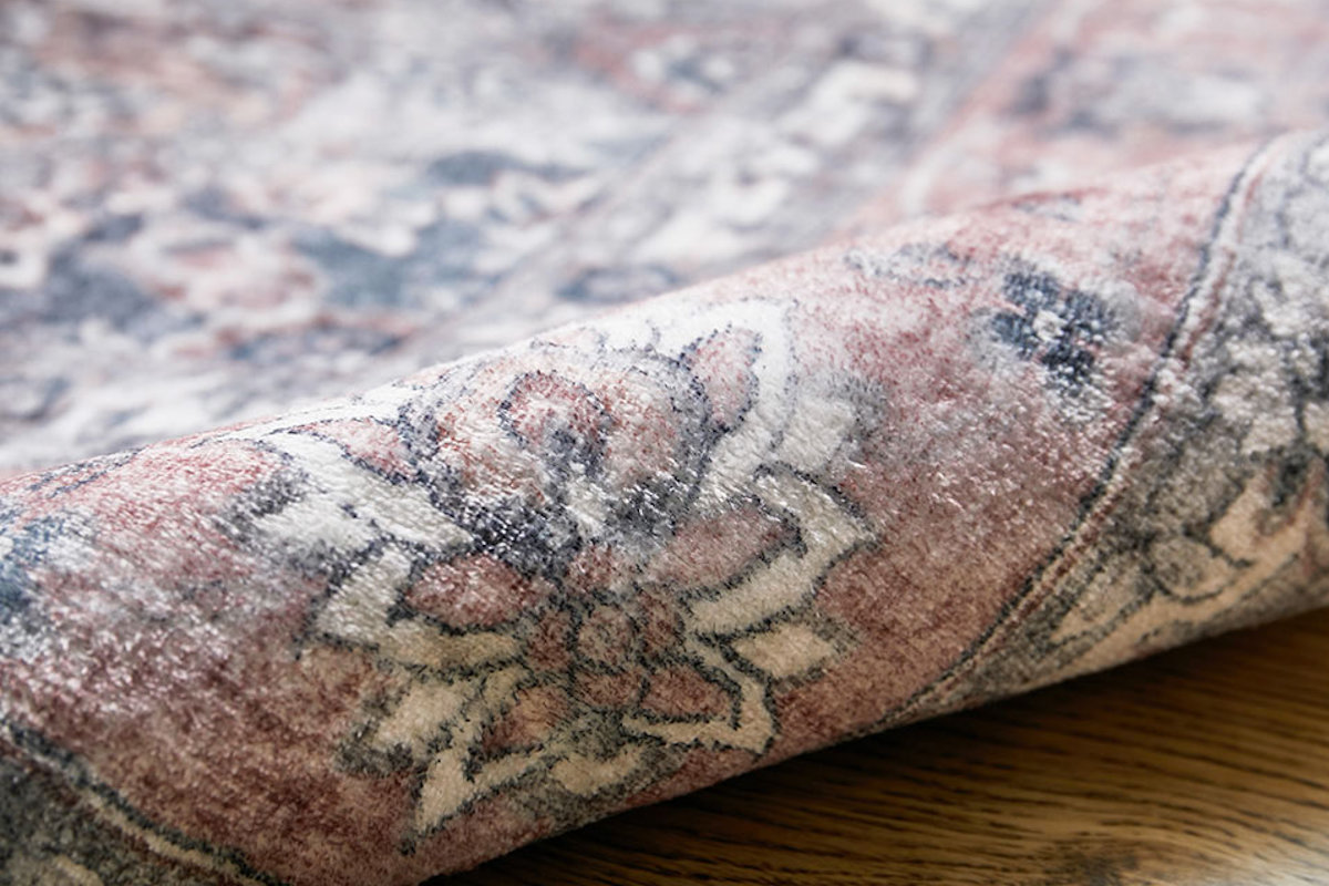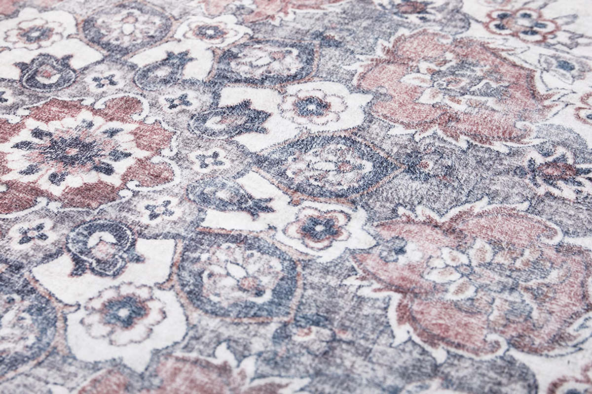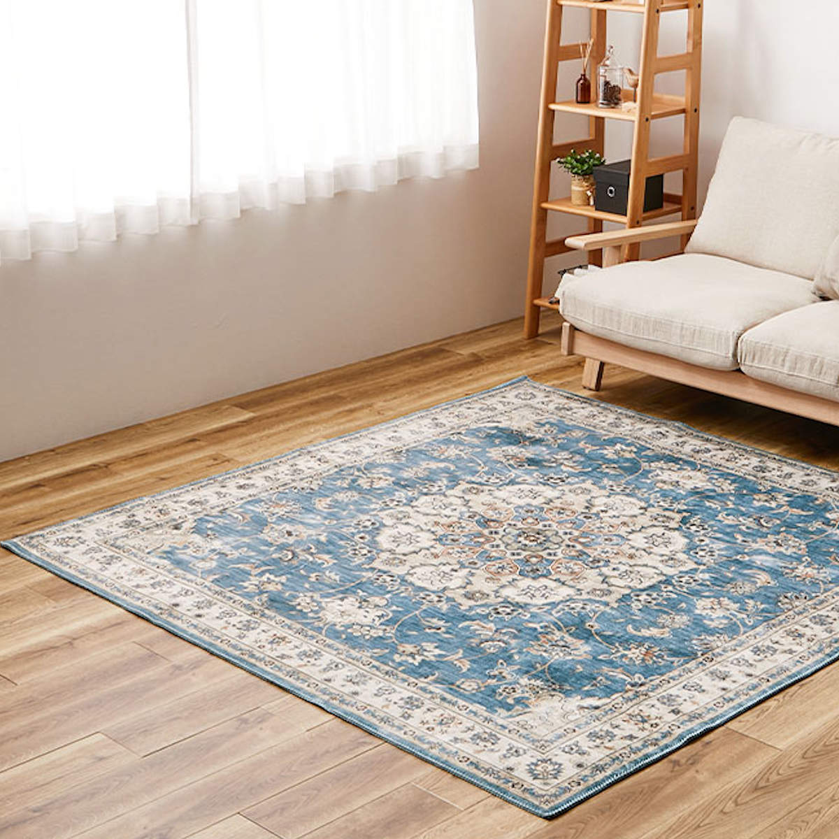 ペルシャ絨毯のクラシックなメダリオン柄と、かすれた風合いを忠実に再現したデザインラグです。リビングなどの中心に敷きやすい正方形サイズです。存在感のあるデザインながら、プリントラグならではの扱いやすさで日常使いに最適です。