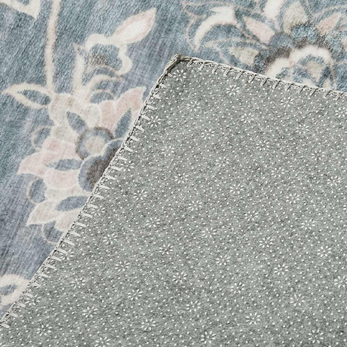 裏面には、花柄ドットの滑り止め加工が施されています。フローリングの上でも滑りにくく、ラグのズレを軽減してくれます。
