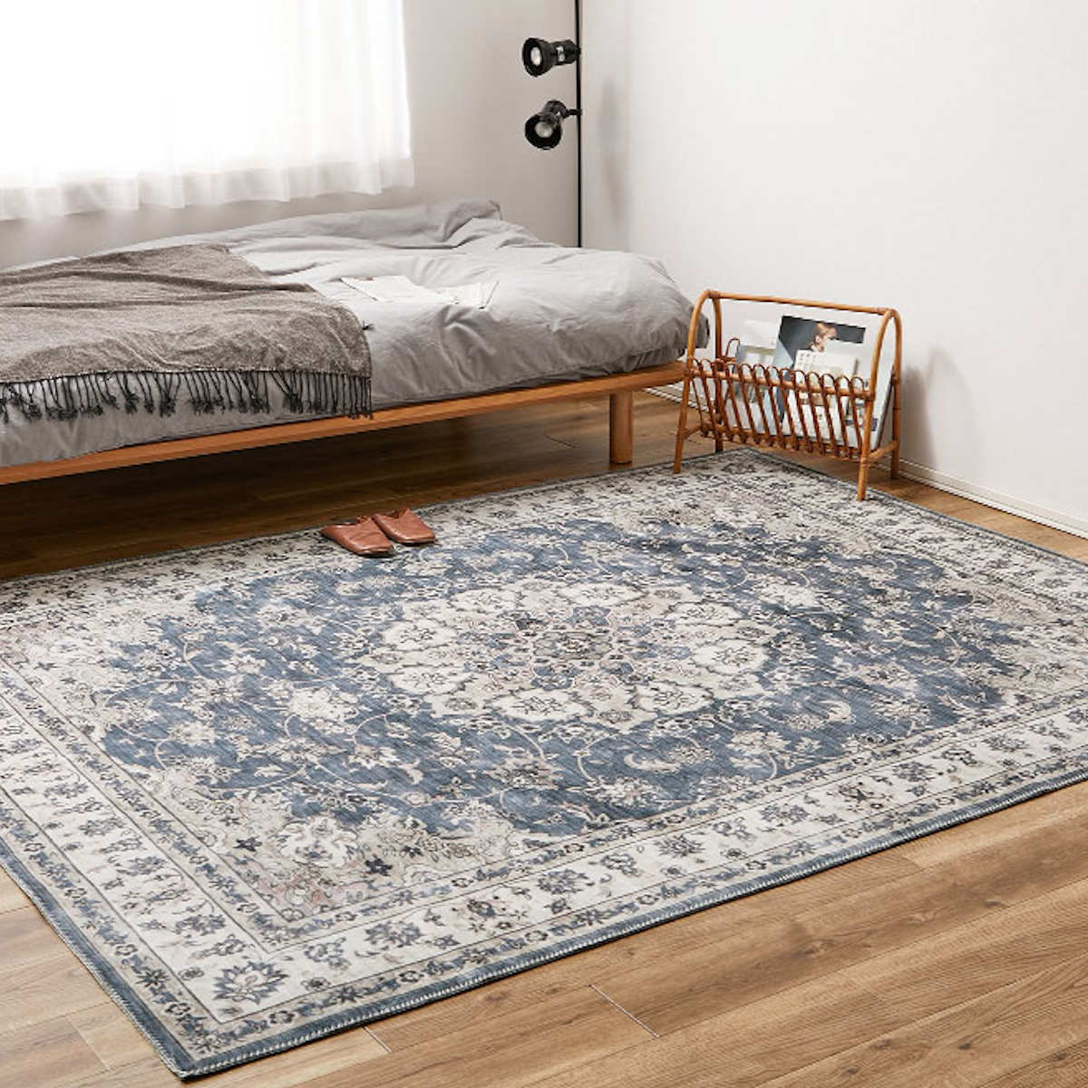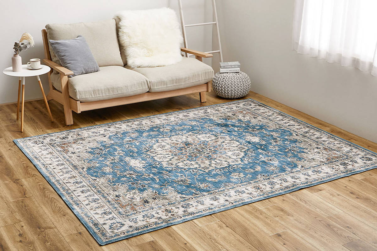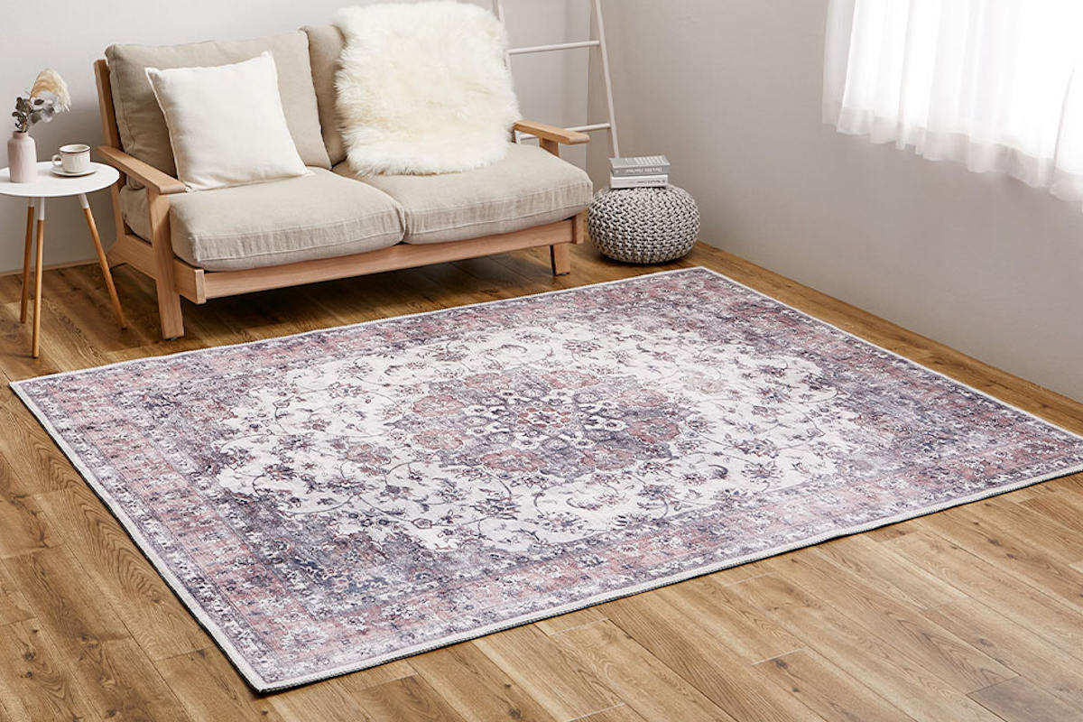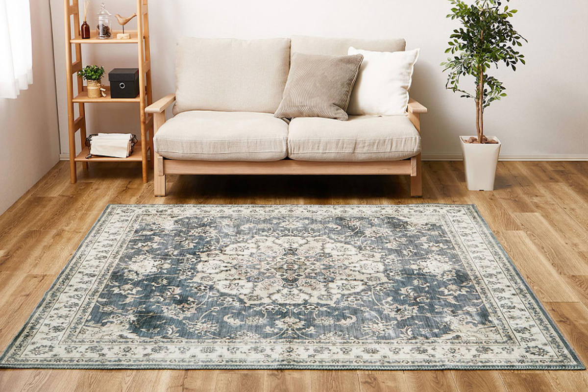 ペルシャ絨毯のクラシックな柄と、かすれた風合いを忠実に再現したデザインラグです。広めのダイニング空間も一枚で美しくまとめ上げます。存在感のあるデザインながら、プリントラグならではの扱いやすさで日常使いにもぴったりです。