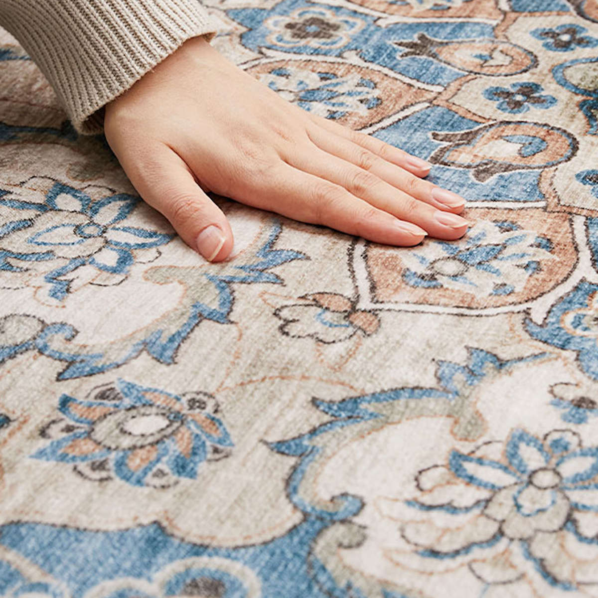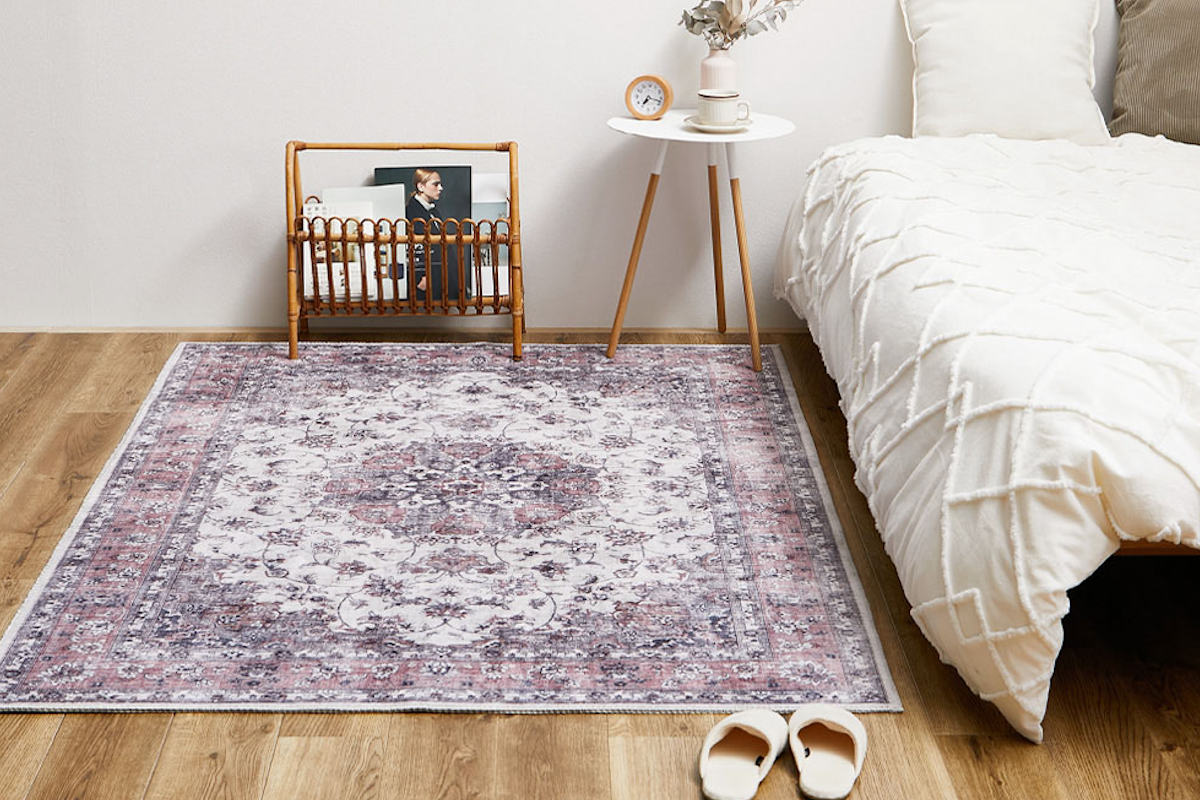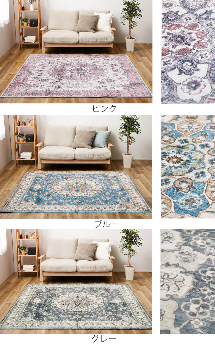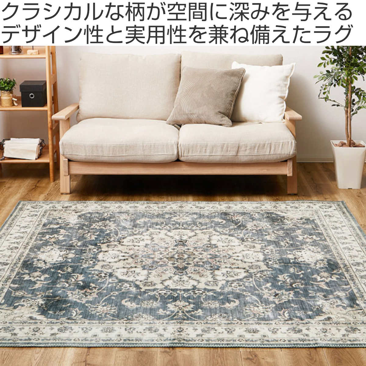 ペルシャ絨毯のクラシックな柄と、かすれた風合いを忠実に再現したデザインラグです。広めのダイニング空間も一枚で美しくまとめ上げます。存在感のあるデザインながら、プリントラグならではの扱いやすさで日常使いにもぴったりです。
