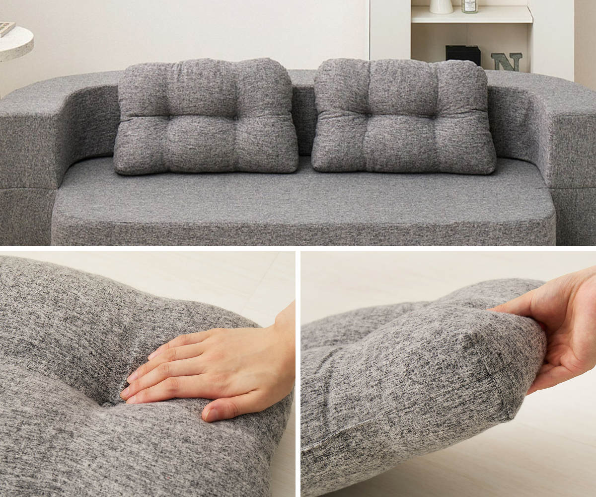 枕や背当てとして使える、もっちりとした弾力のクッションが2個付属しています。丸みのあるフォルムが、デザインのアクセントにもなっています。