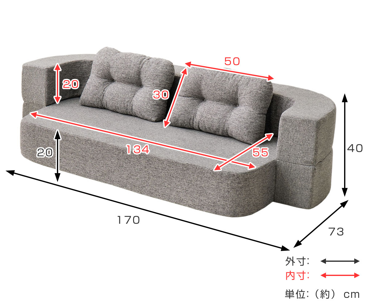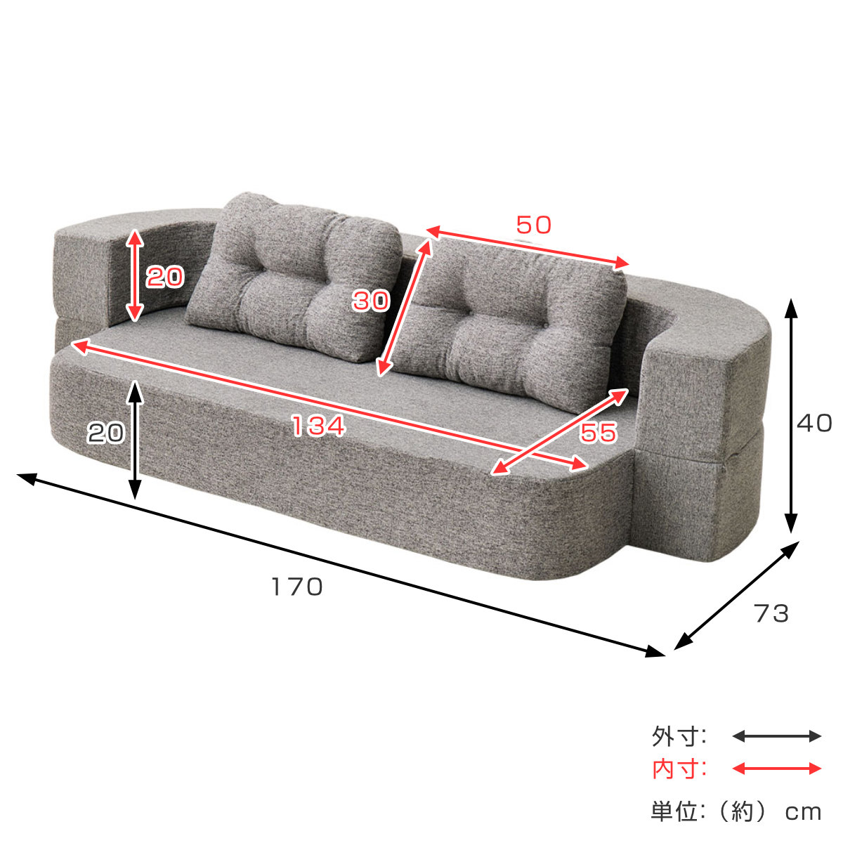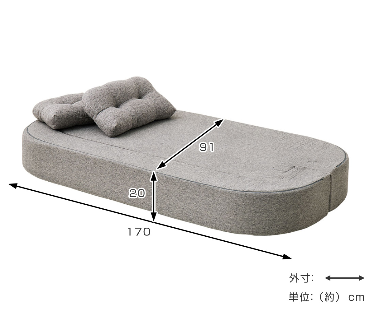 | サイズ | ソファスタイル:約 幅170×奥行73×高さ40(cm) ※座面高:20cm ベッドスタイル:約 幅170×奥行91×高さ20(cm) |