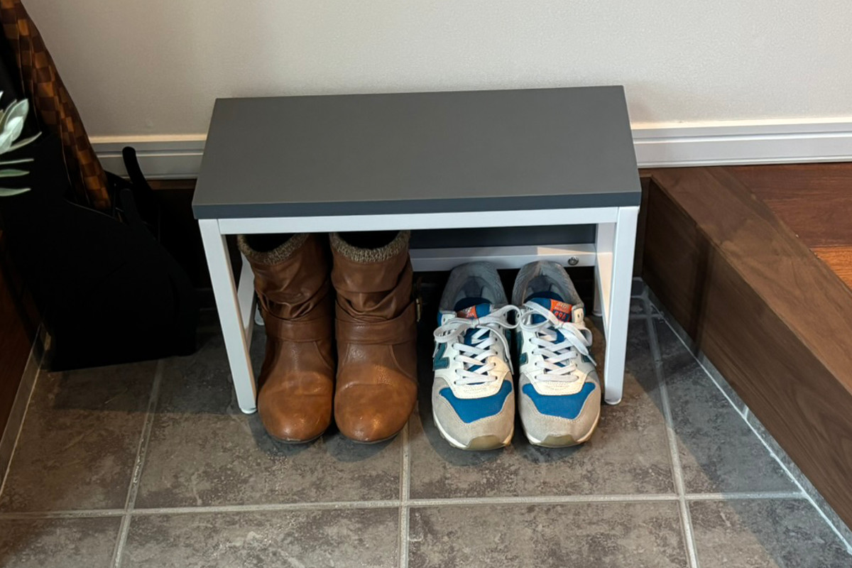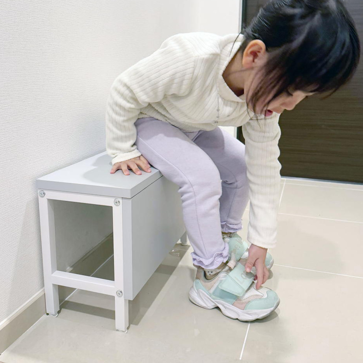 小さな子どもが座って靴を履きやすい高さで、バランスを崩さず靴の履き替えができます。天板下に靴を収納できるので、狭い玄関にも置きやすいです。