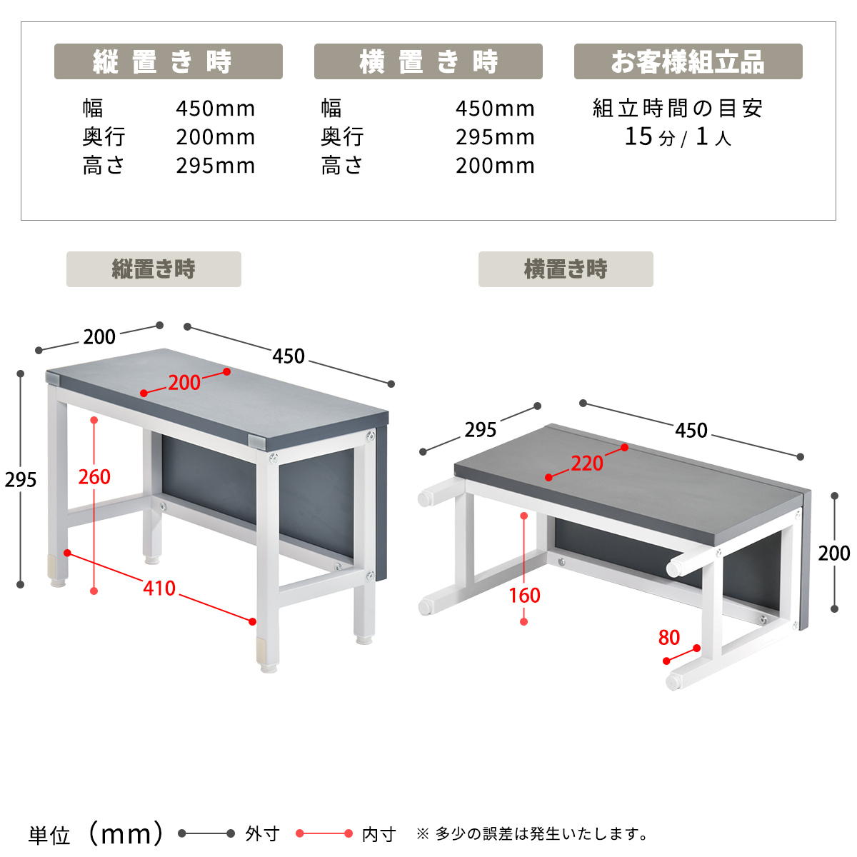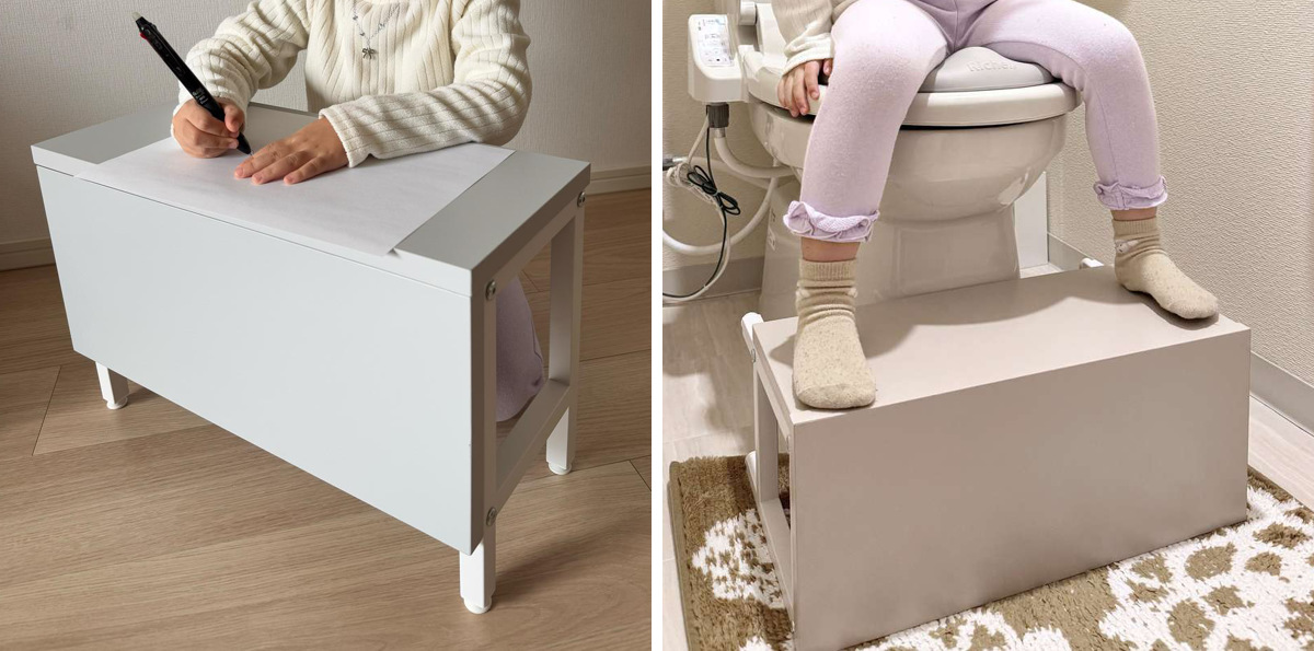 天板が短辺と長辺の2か所についているので、 長辺側の天板はデスクとして、短辺側はトイレの踏み台などといった使い分けも可能です。