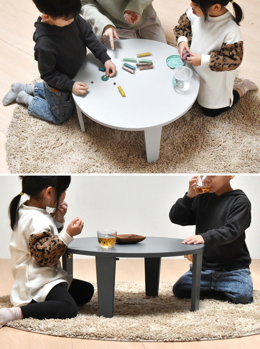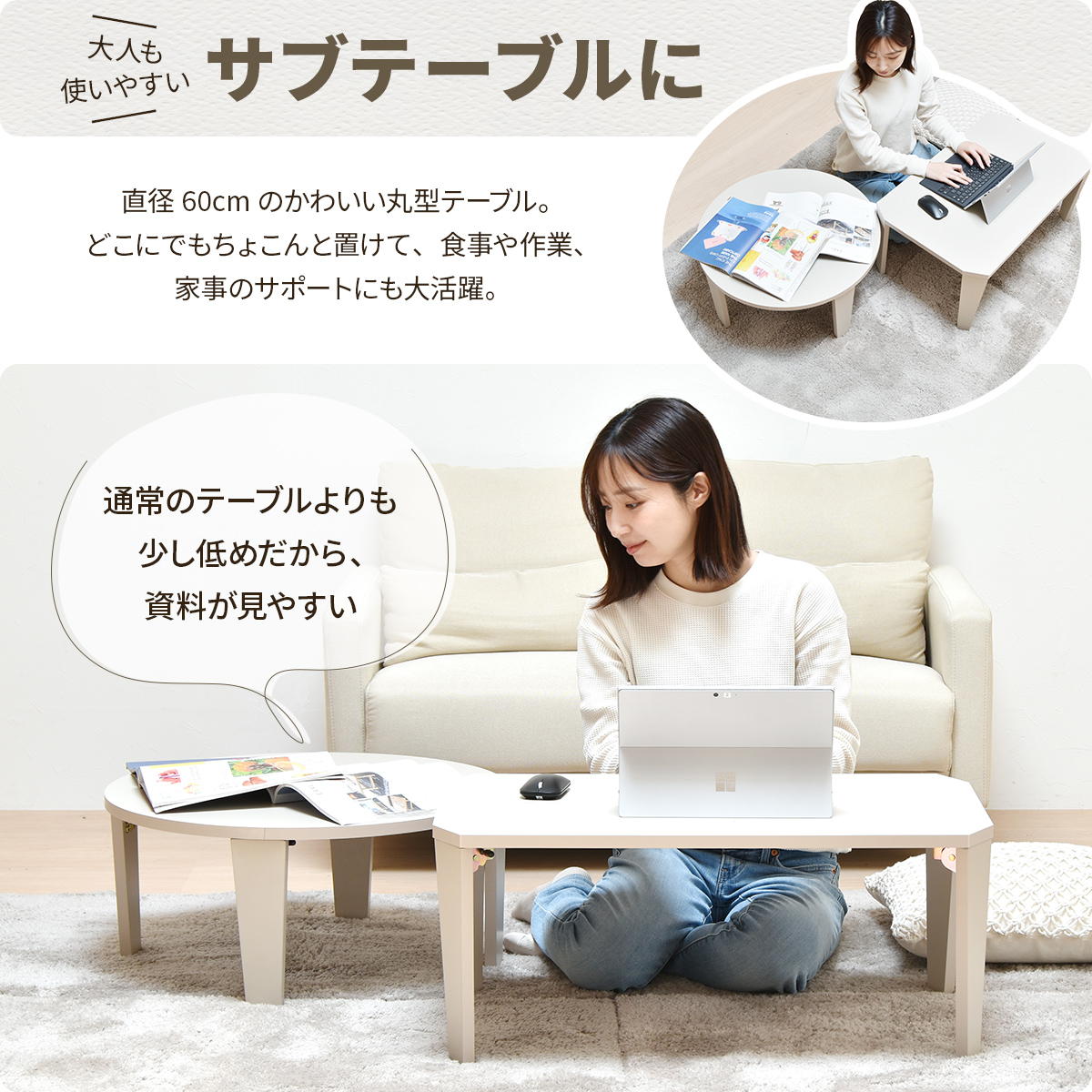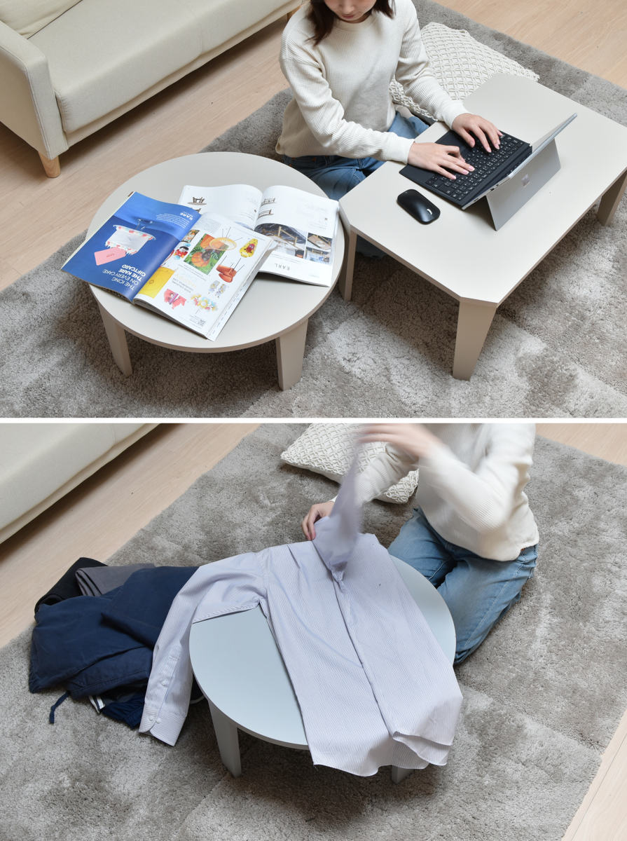 直径60cmなのでどこにでもちょこんと置けて、食事やPC作業、家事のサポートなど様々なシーンで活躍します。通常のテーブルよりも少し低めの設計なので、資料が見やすいのもポイントです。