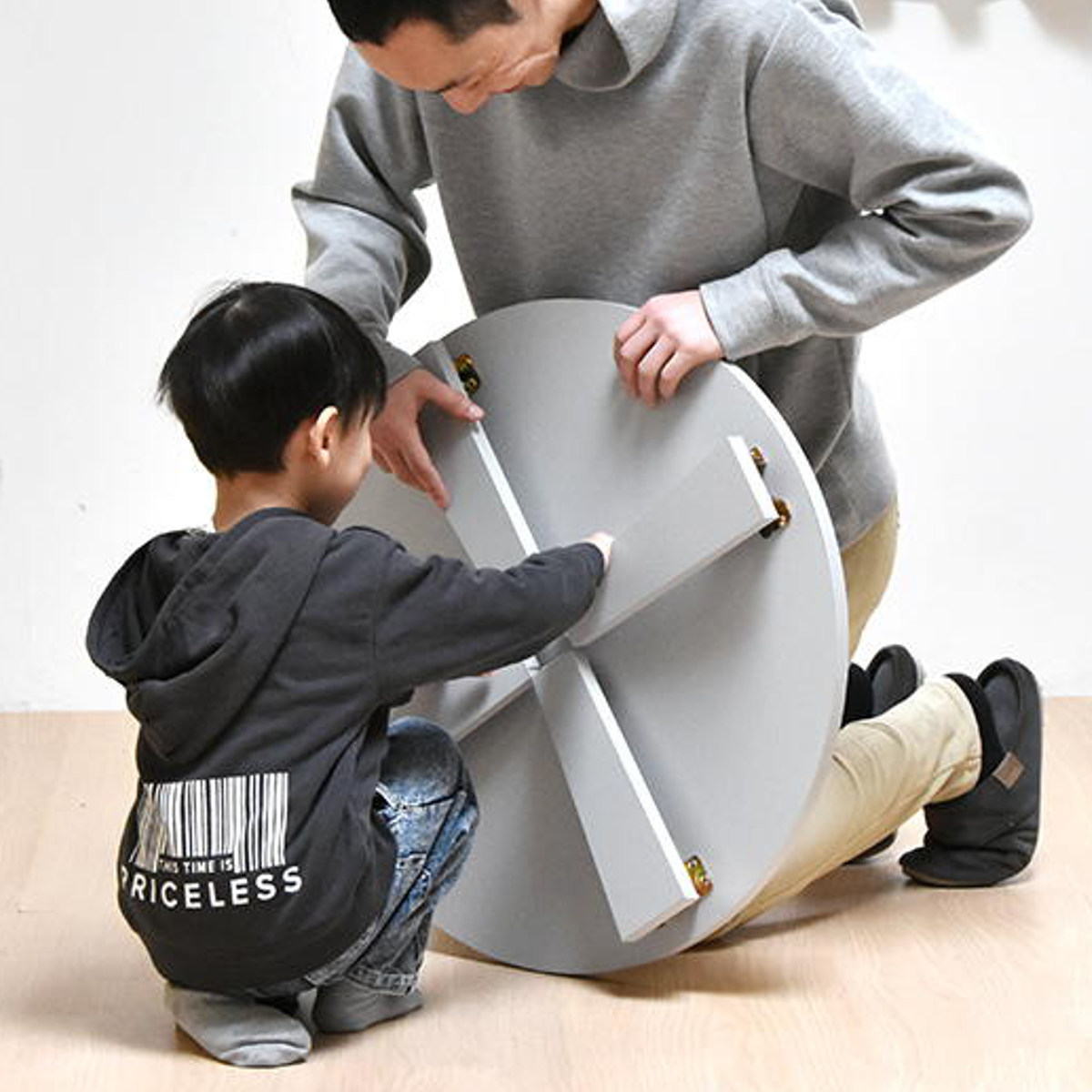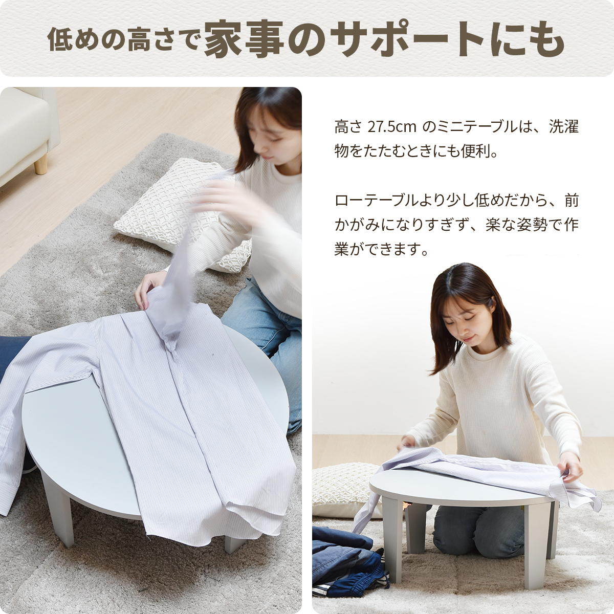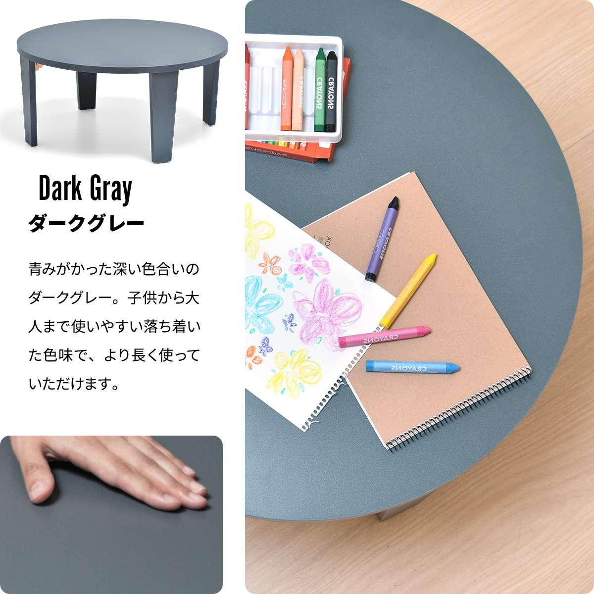 直径60cmなのでどこにでもちょこんと置けて、食事やPC作業、家事のサポートなど様々なシーンで活躍します。通常のテーブルよりも少し低めの設計なので、資料が見やすいのもポイントです。