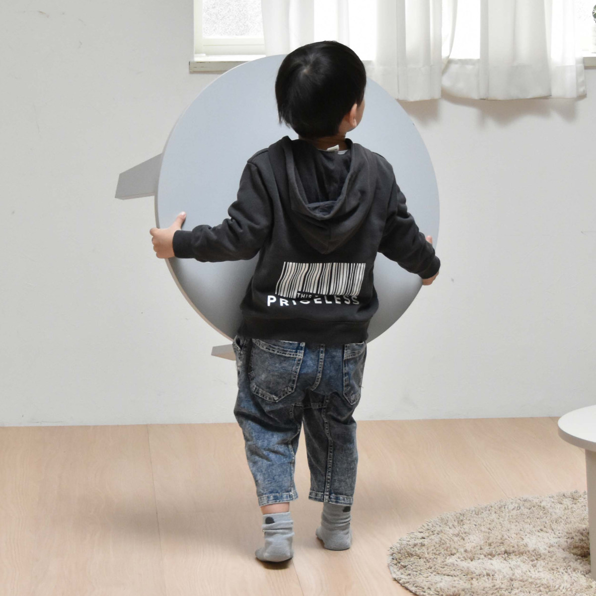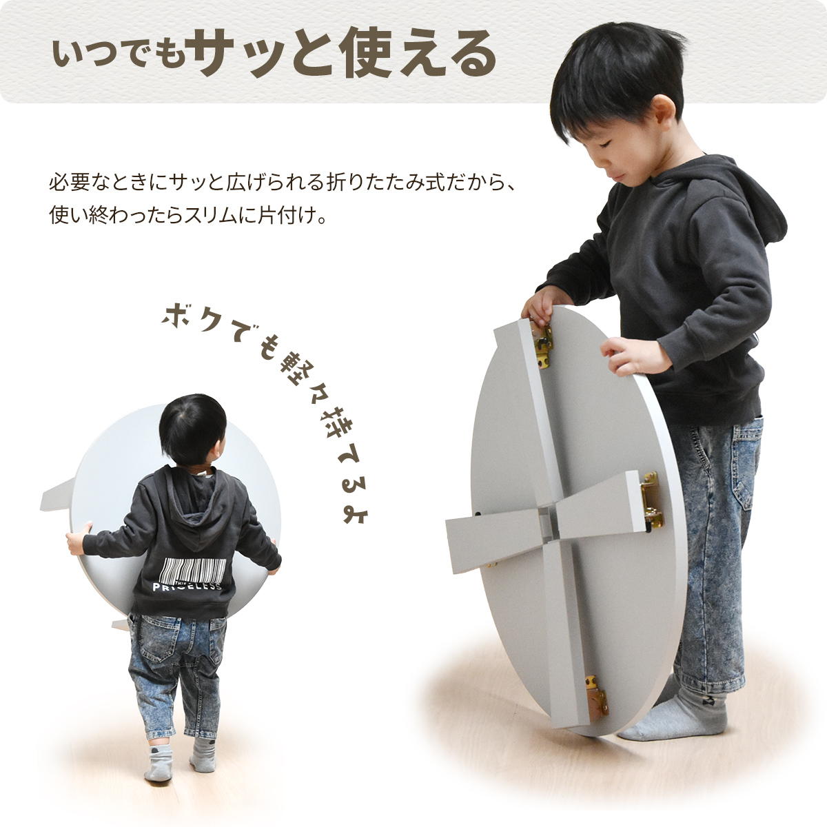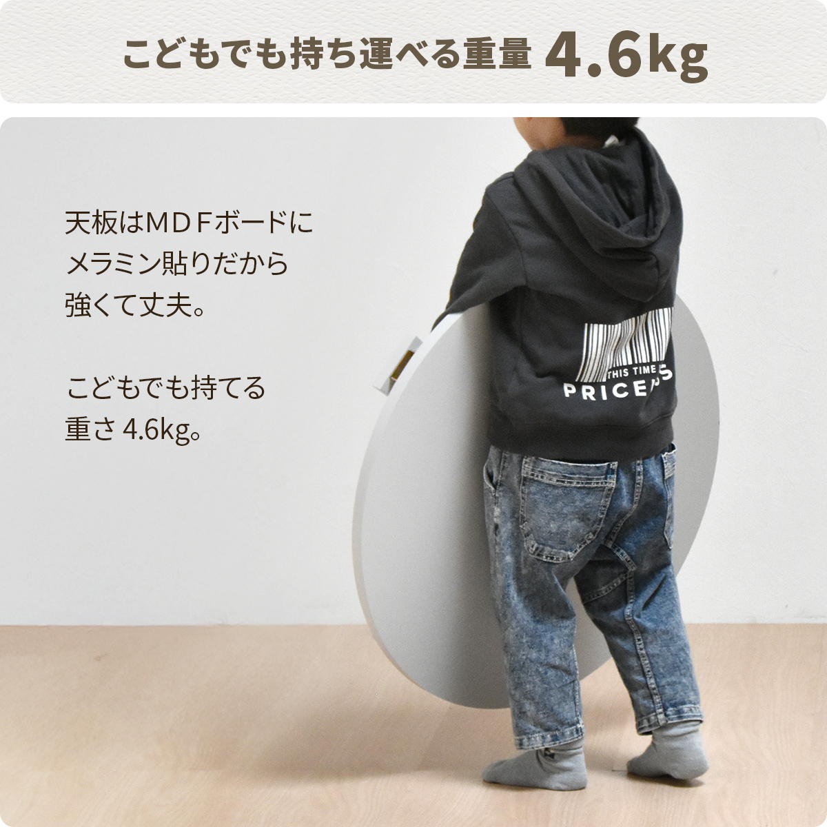 重さは4.6kgと軽く子どもでも持てるので、お片付けの練習になります。天板はMDFボードにメラミン貼りのため軽量かつ強くて丈夫です。