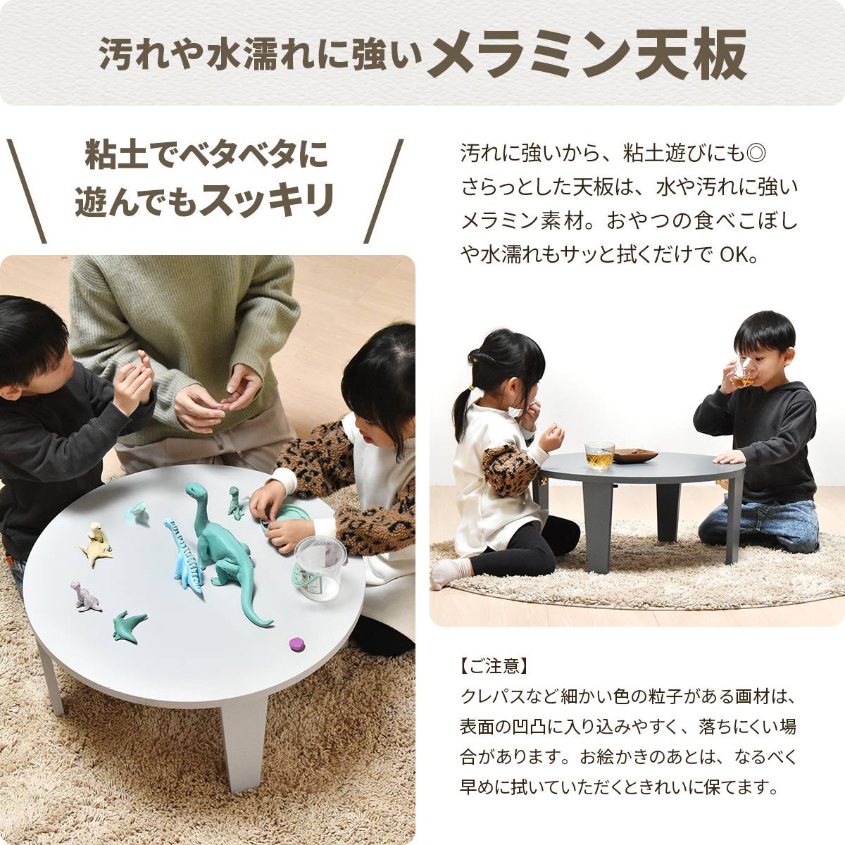 汚れに強いので、粘土遊びにもぴったり。おやつの食べこぼしや水濡れもサッと拭くだけでOKです。