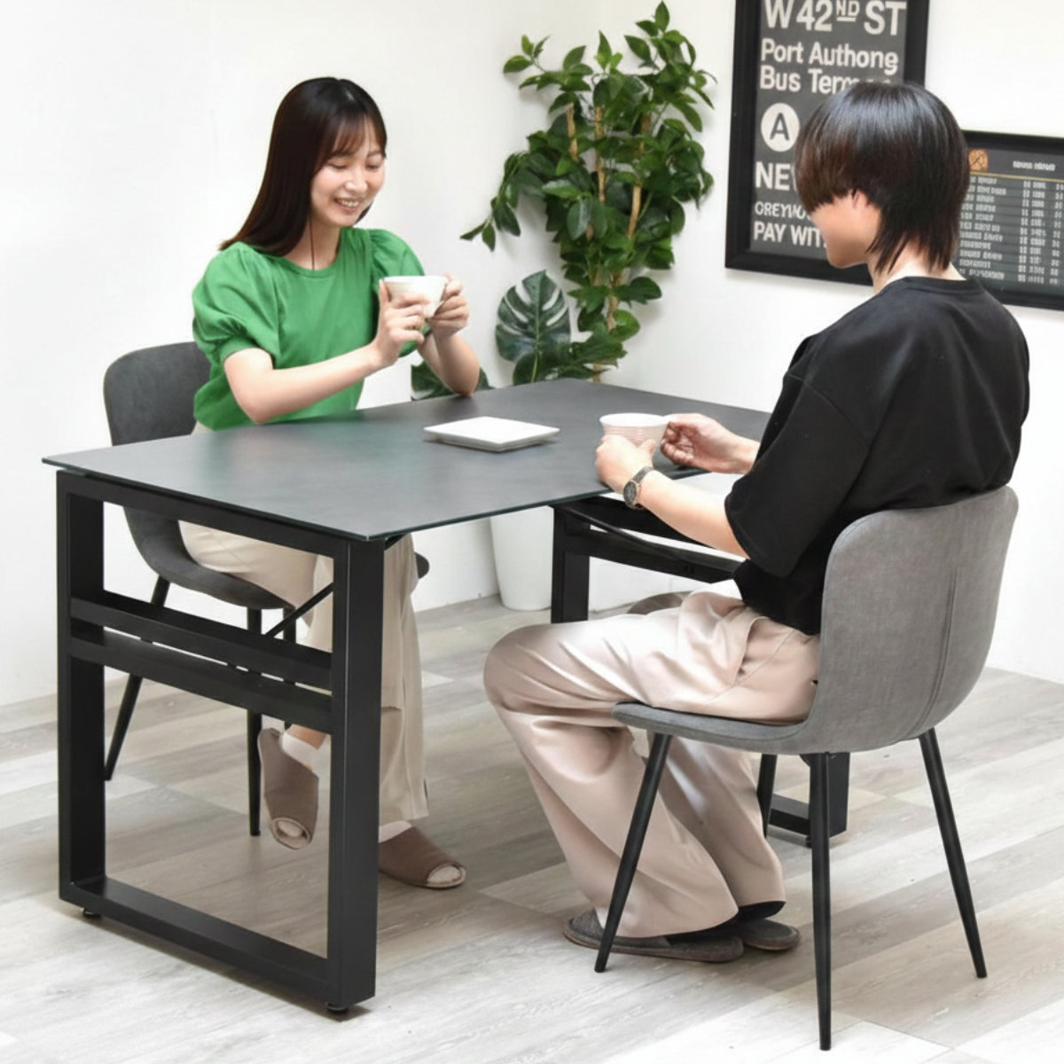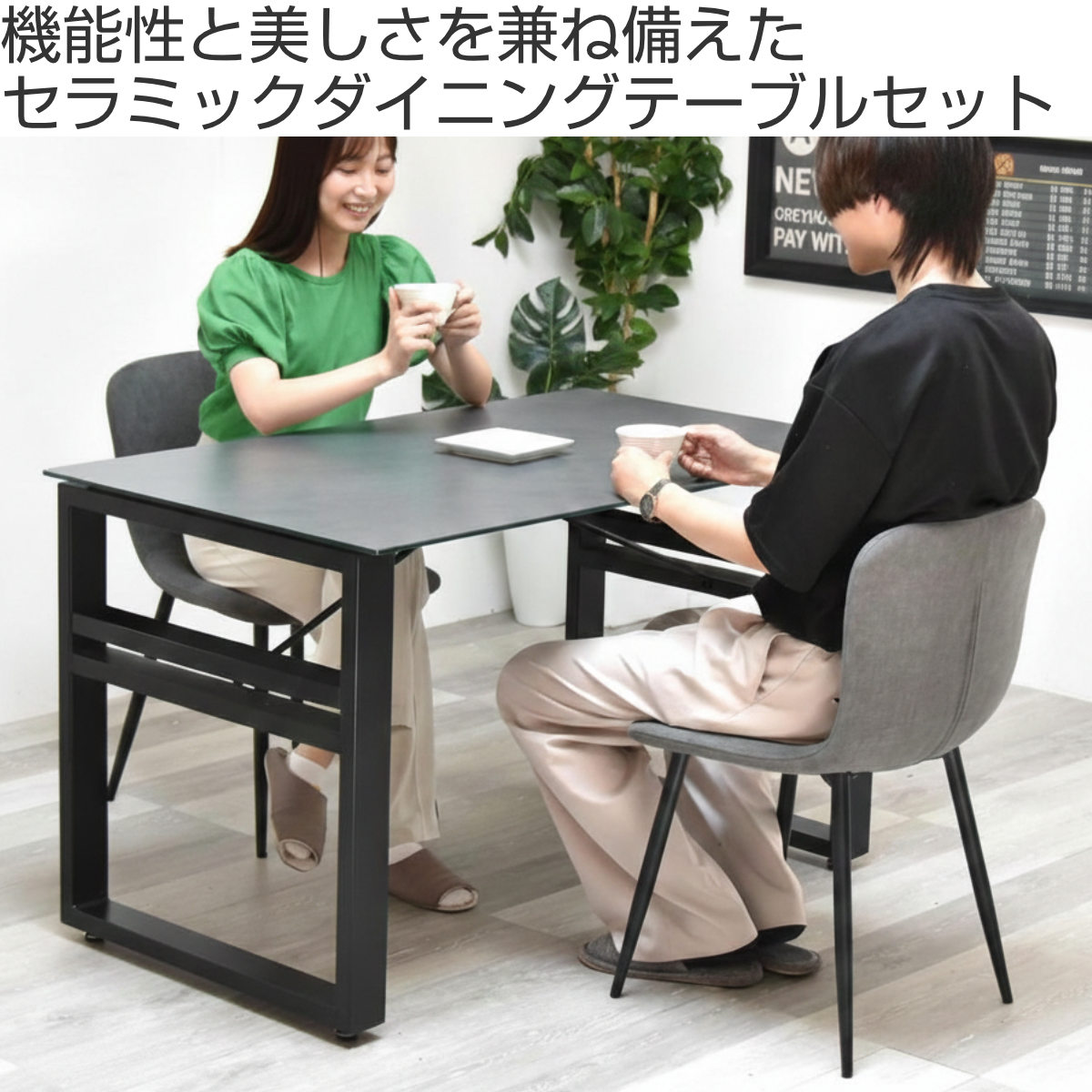 幅120cmのセラミック天板テーブルとチェア2脚の3点セット。熱やキズに強い天板に、石目調の上質な表情がダイニングを落ち着いた雰囲気に演出します。チェアと調和し、機能性と美しさを兼ね備えた空間に。