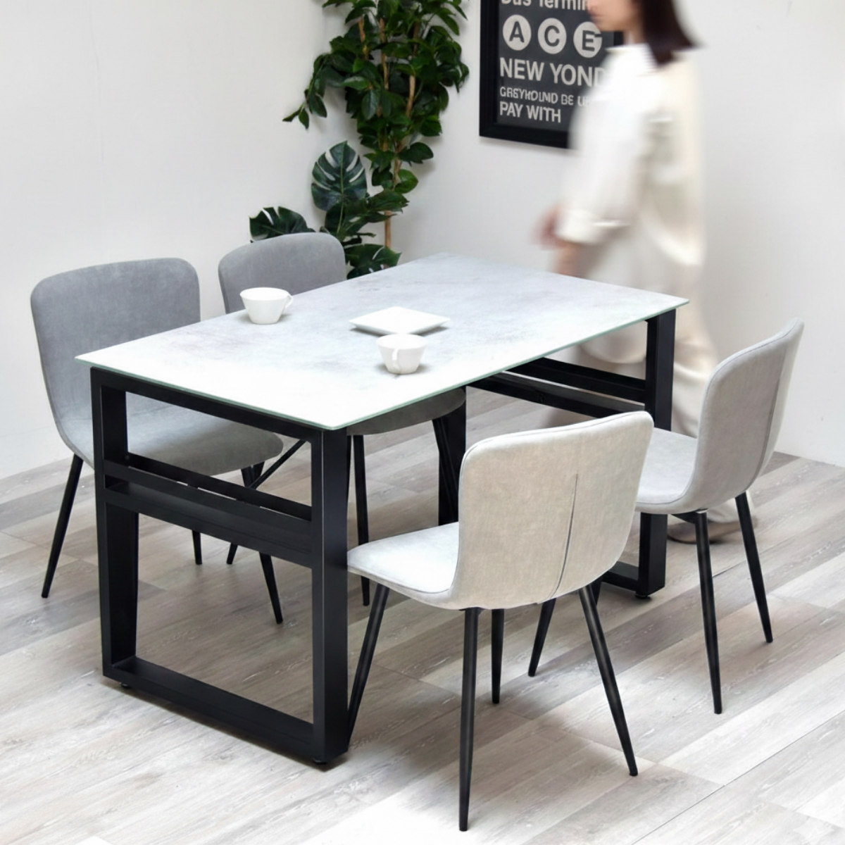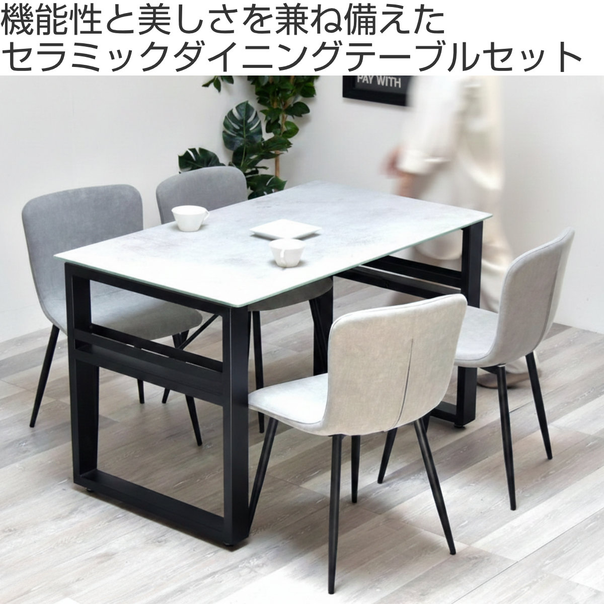 幅120cmのセラミック天板テーブルとチェア4脚の5点セット。熱やキズに強い天板に、石目調の上質な表情がダイニングを落ち着いた雰囲気に演出します。チェアと調和し、機能性と美しさを兼ね備えた空間に。