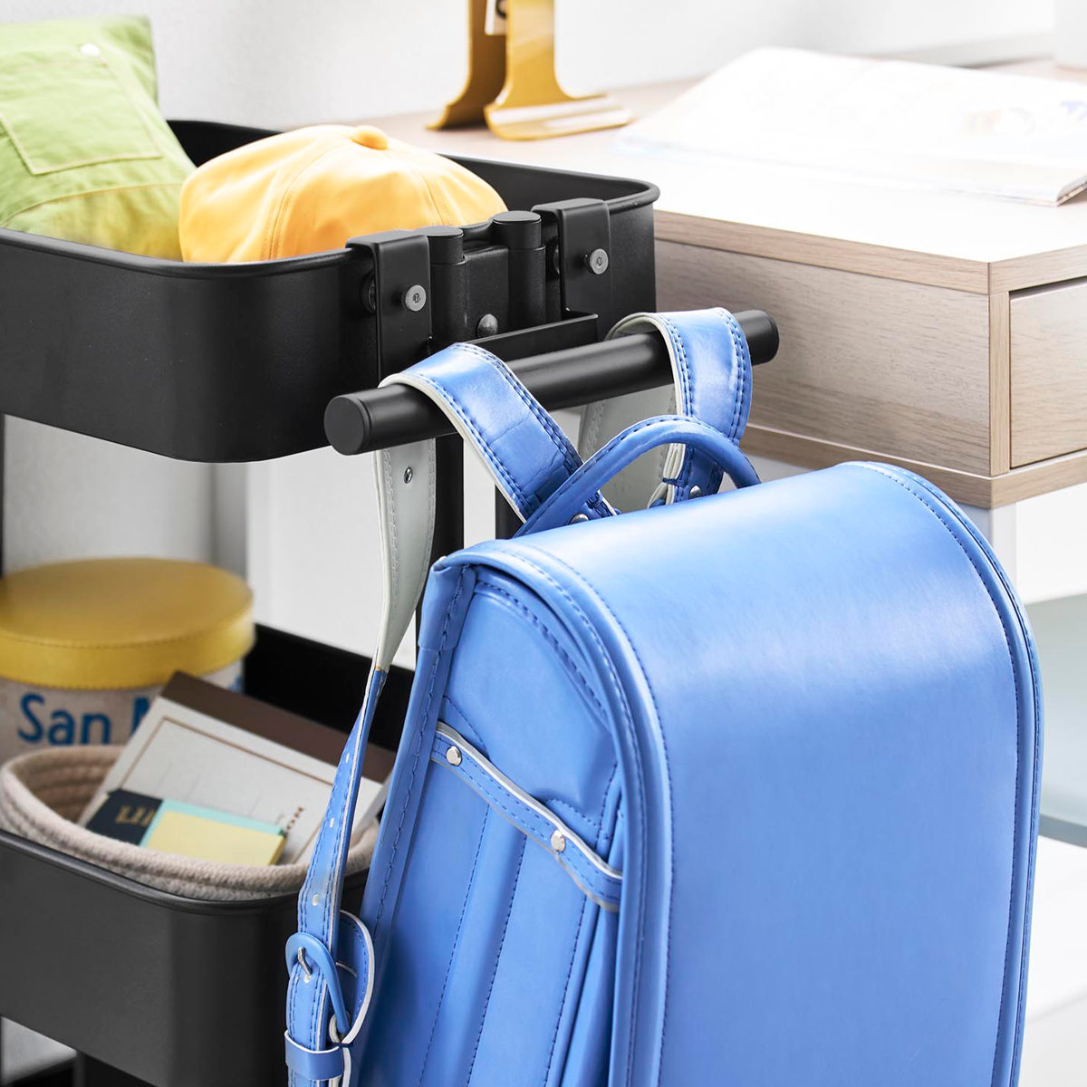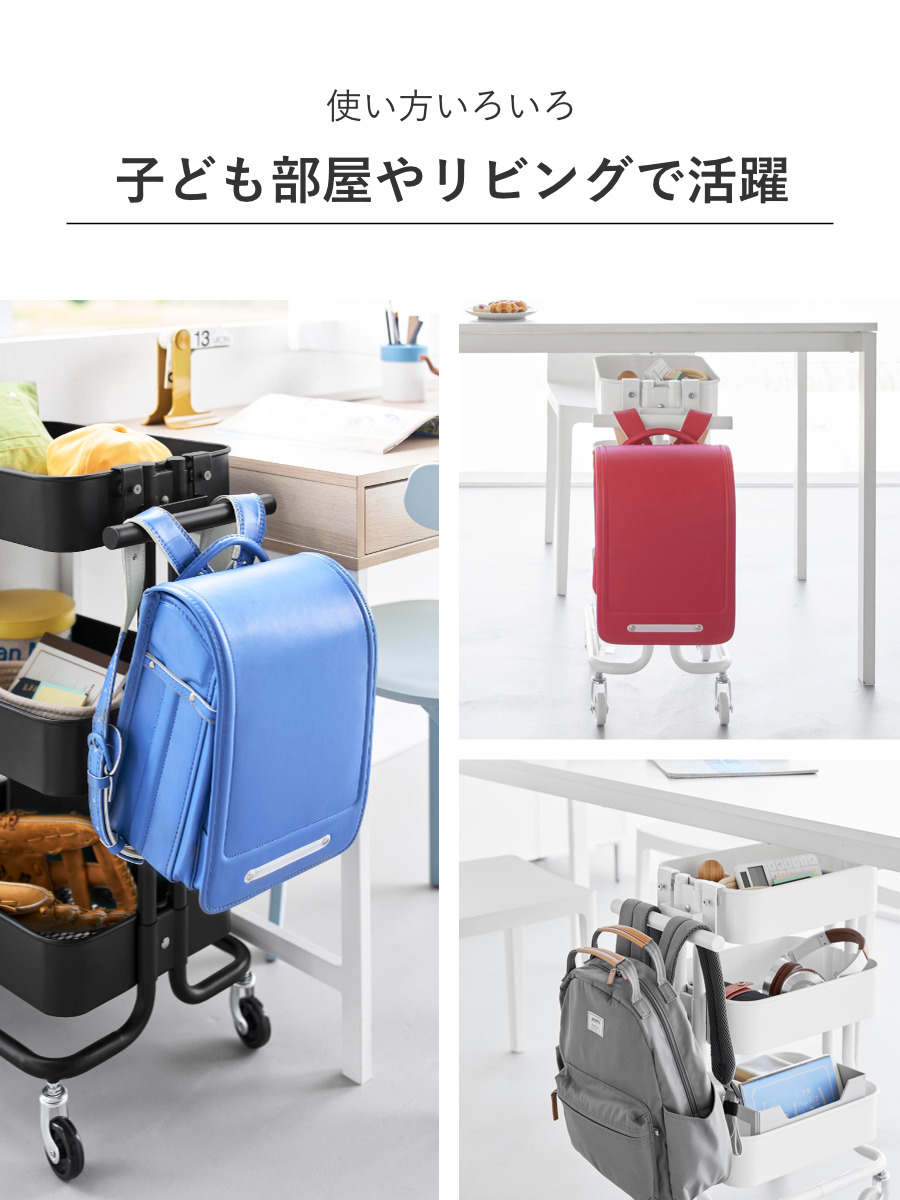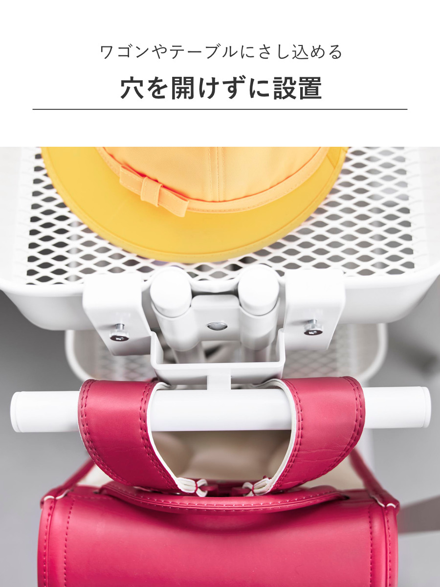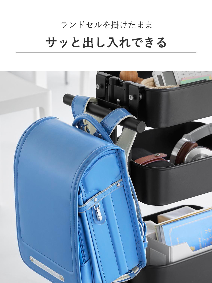 | 注意事項 | ※必ずスチールワゴンに物(重さの目安:5kg以上)を載せてご使用ください ※ランドセルやワゴンのサイズ・形状・仕様によっては、収納・取り付けができない場合があります |