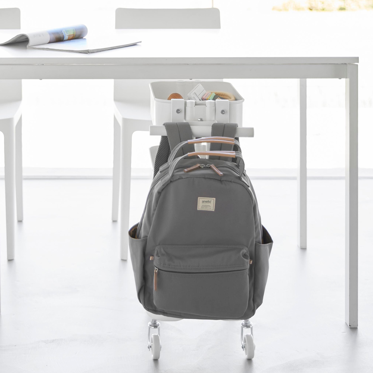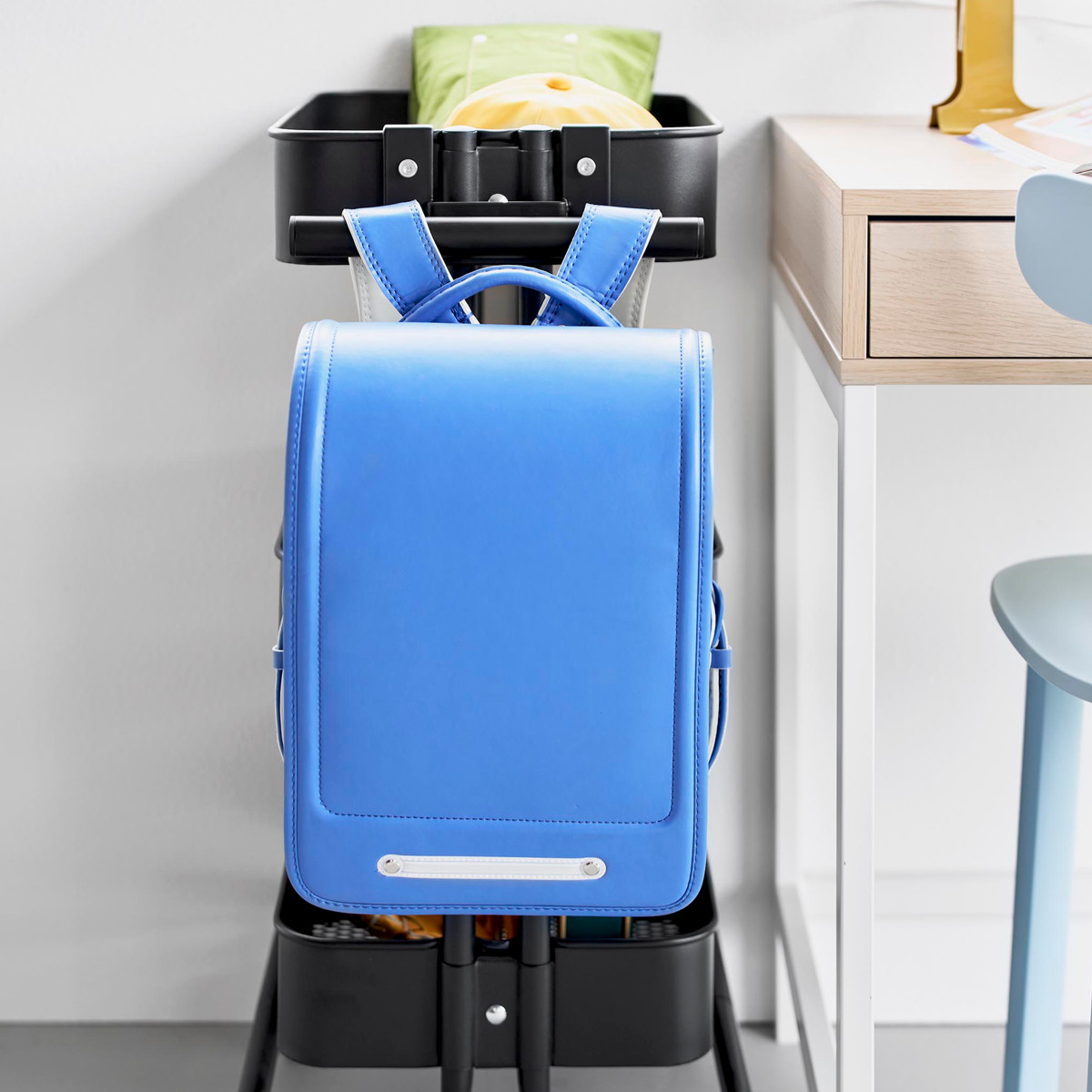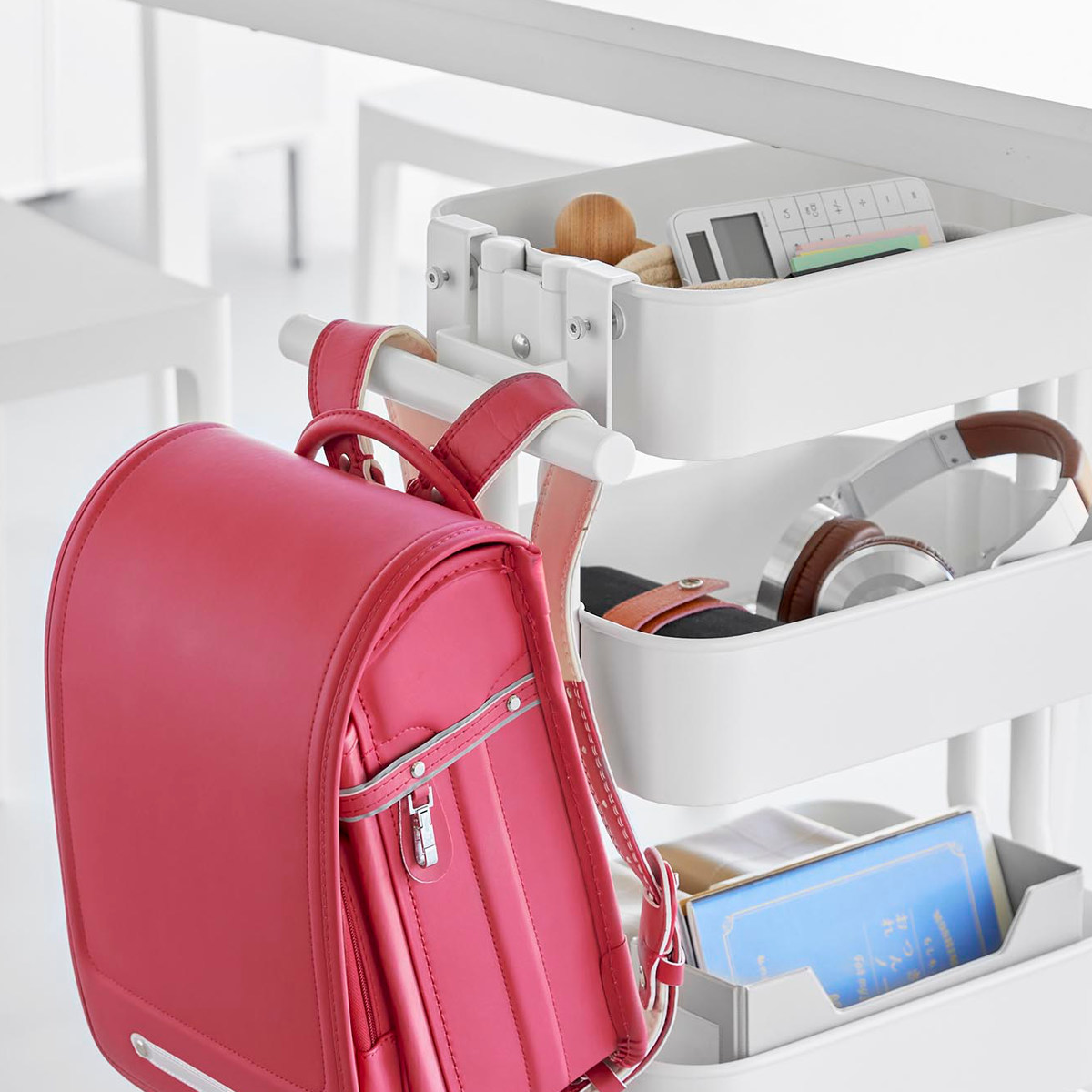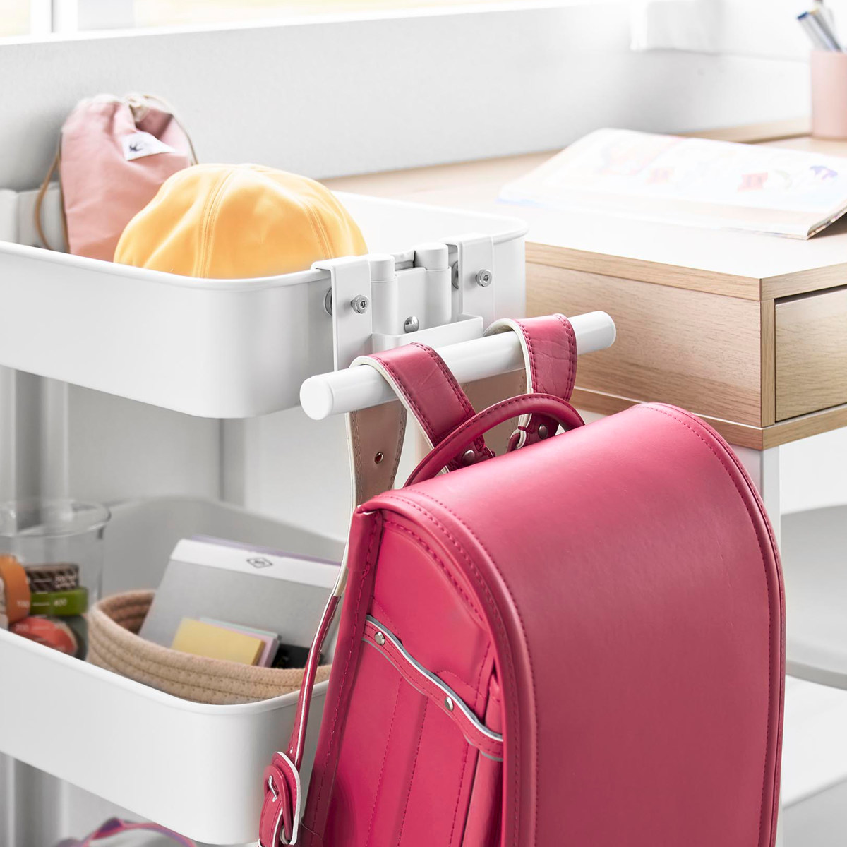 | 注意事項 | ※必ずスチールワゴンに物(重さの目安:5kg以上)を載せてご使用ください ※ランドセルやワゴンのサイズ・形状・仕様によっては、収納・取り付けができない場合があります |