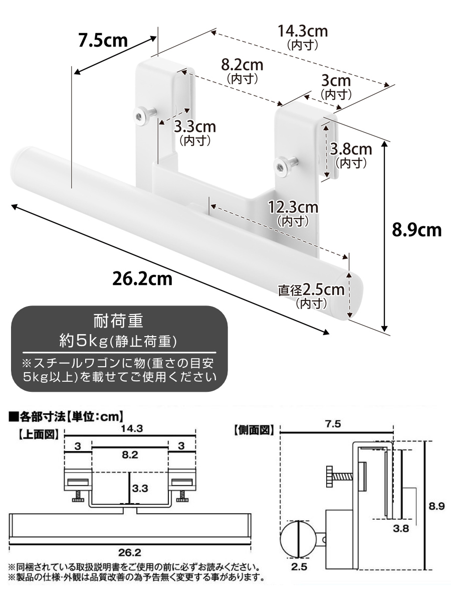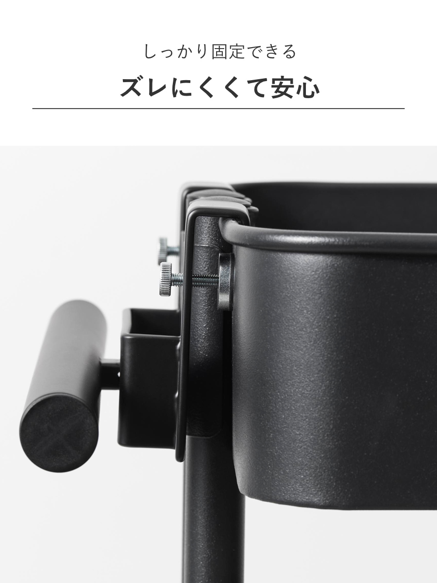 | 備考 | 【取り付け可能なスチールワゴンのバスケット】 バスケット(短辺側):幅(直線部分)15cm以上・厚さ8mm以内・高さ(深さ)4cm以上 支柱:幅8.2cm以内・奥行(バスケット内側から)3.3cm以内 |