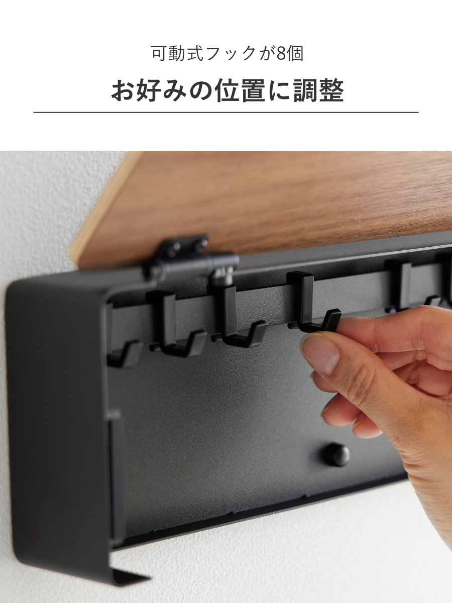 可動式フックが8個付属しており、鍵のサイズや本数に合わせてお好みの位置に調整可能。家族分の鍵をまとめて管理できます。