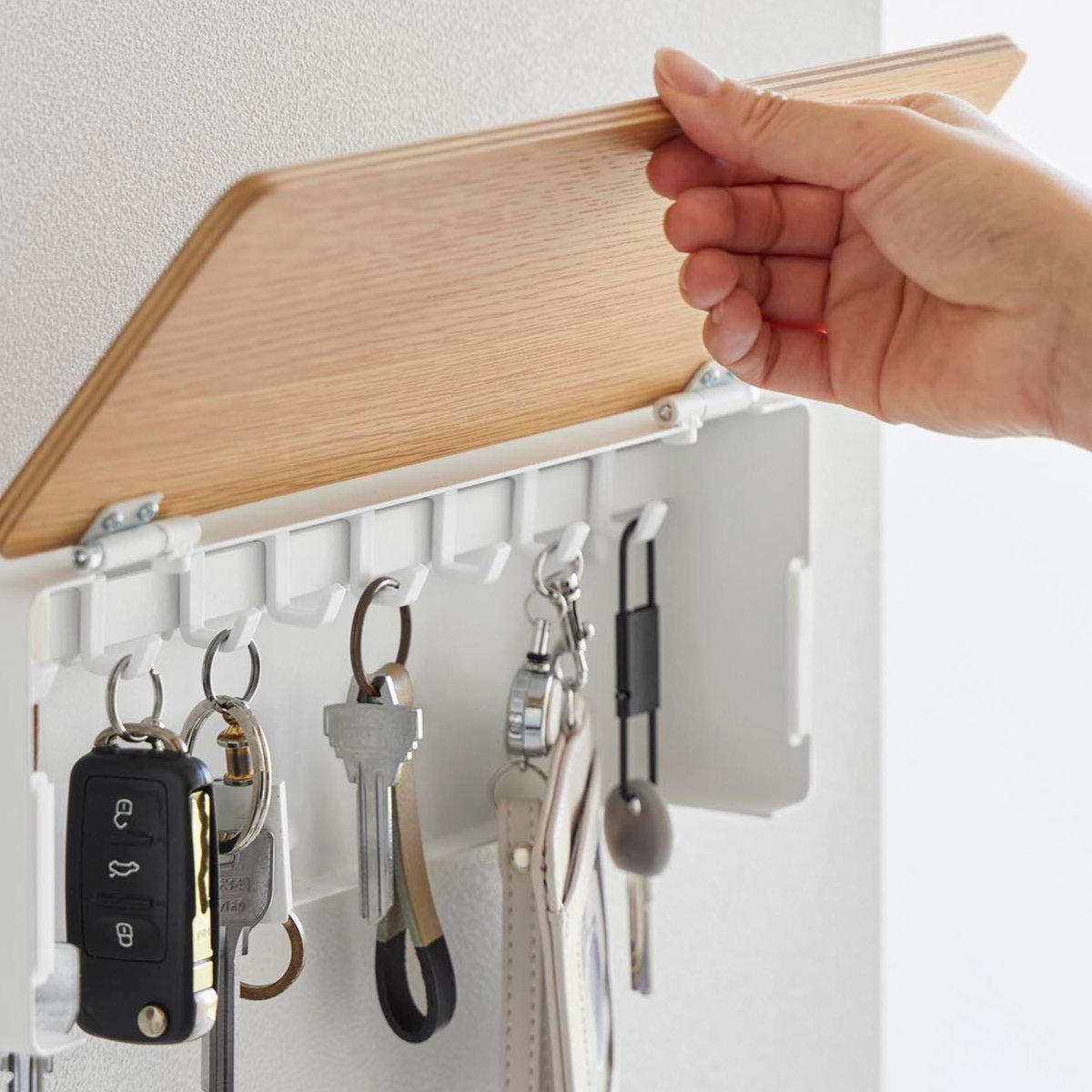 扉は片手で簡単に開閉でき、開いた状態をキープできる設計なので、忙しい外出時や帰宅時もスムーズに鍵を出し入れできます。