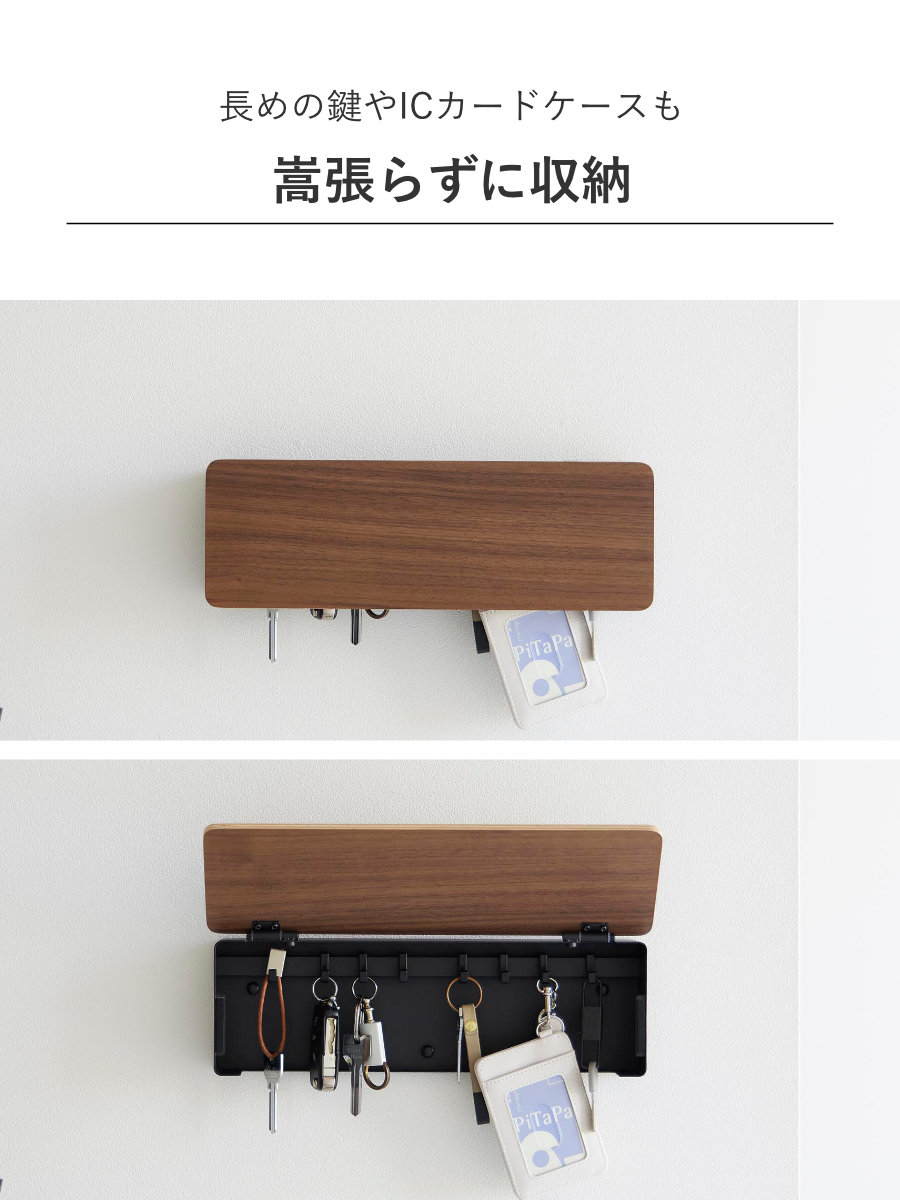 下部がオープンになった設計のため、長めの鍵やICカードケース、キーホルダー付きの鍵もすっきり収納できます。