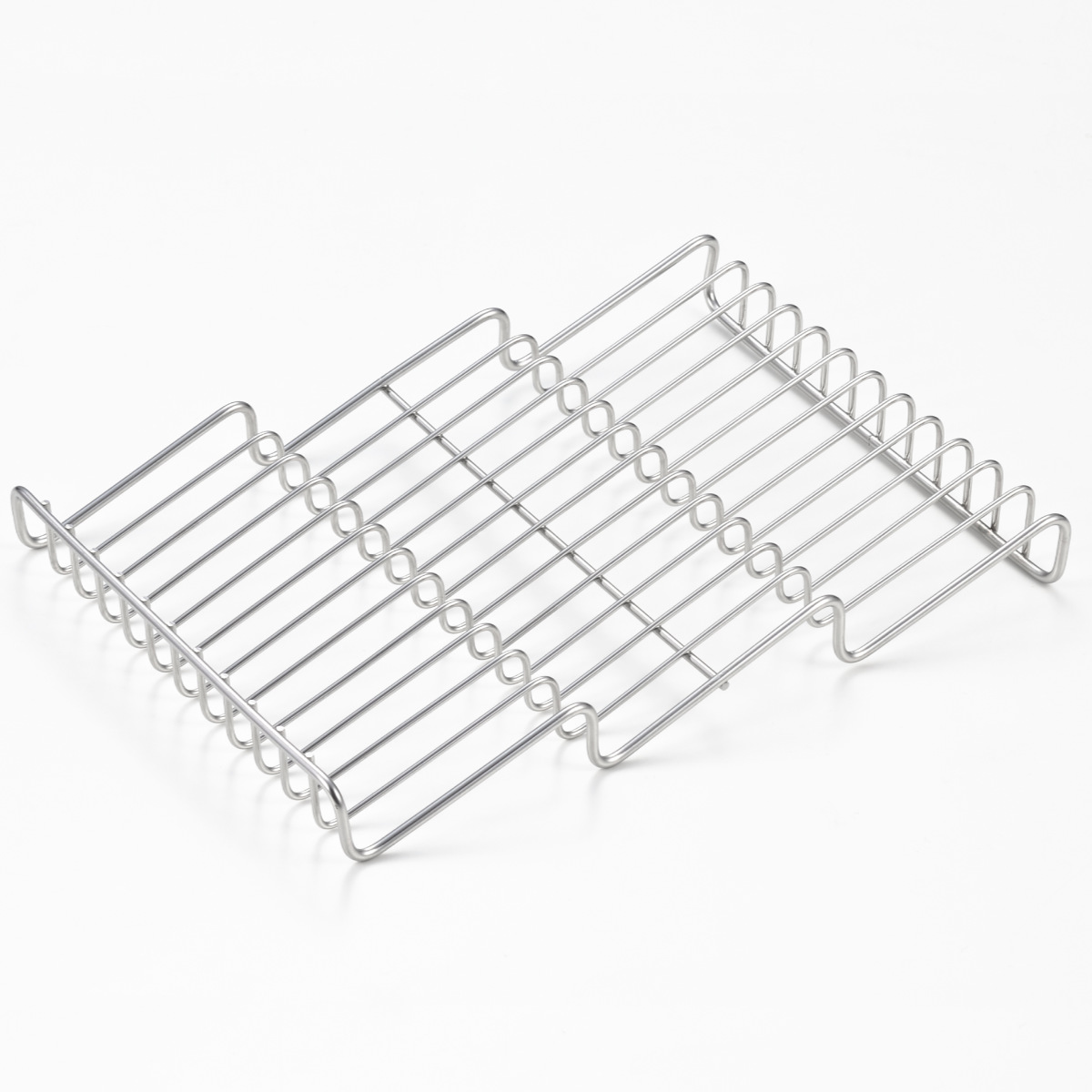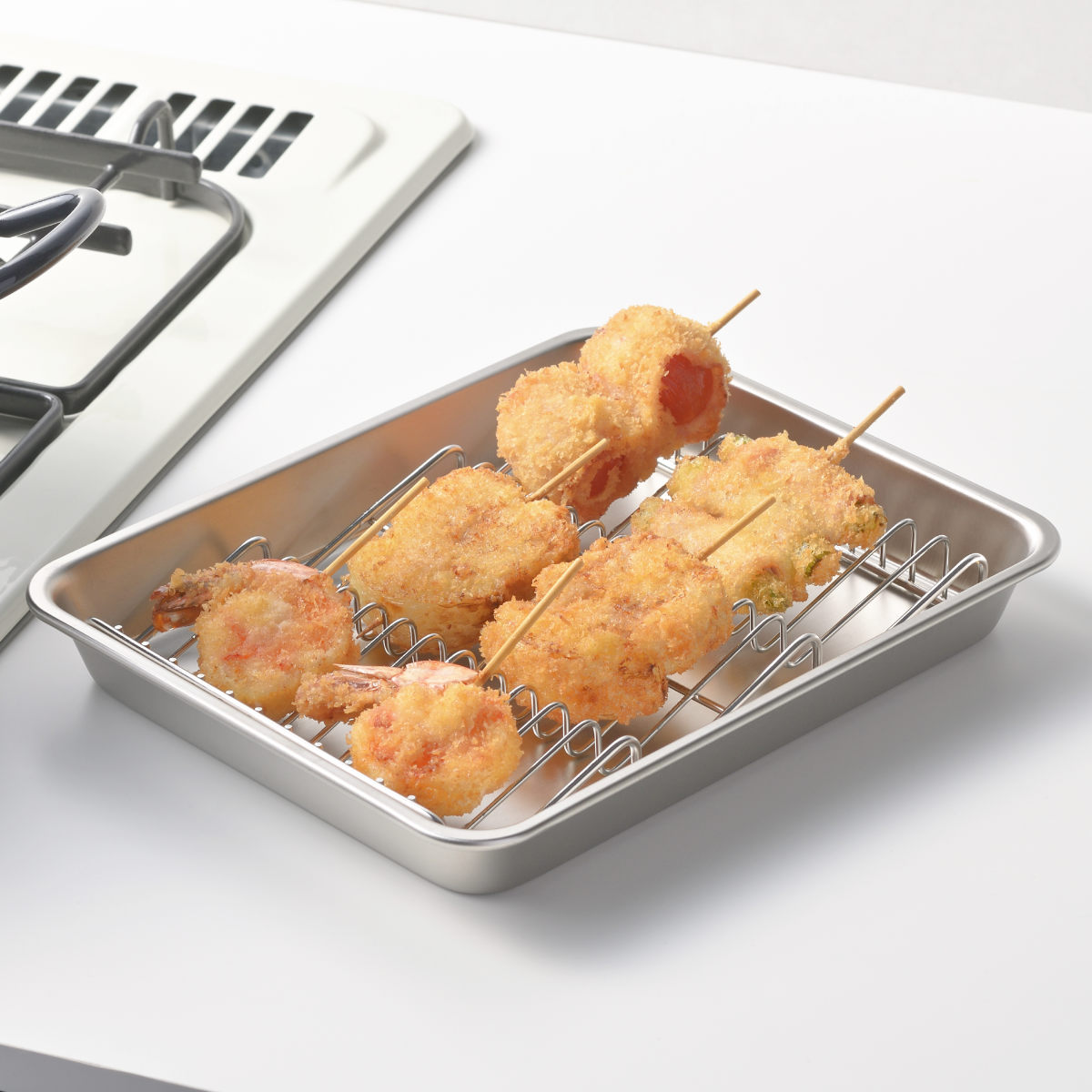 斜め形状の波型アミが揚げ物同士の重なりを防ぎ、余分な油をカットするため、油切れが良くサクッと軽い食感に仕上がります。21枚取(24.8cm)のバットにぴったり収まるサイズです。