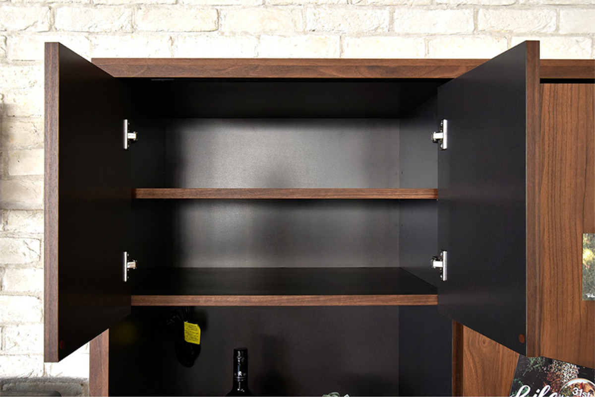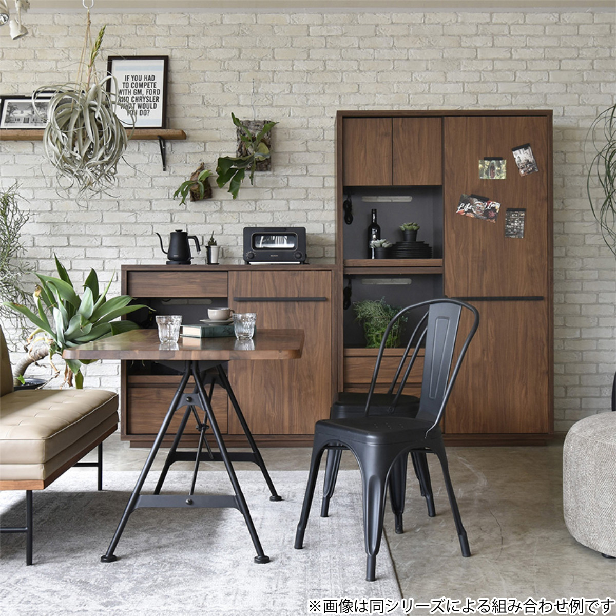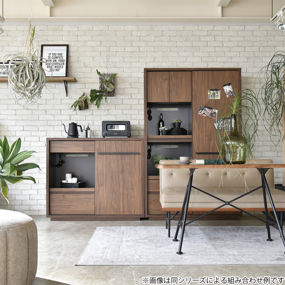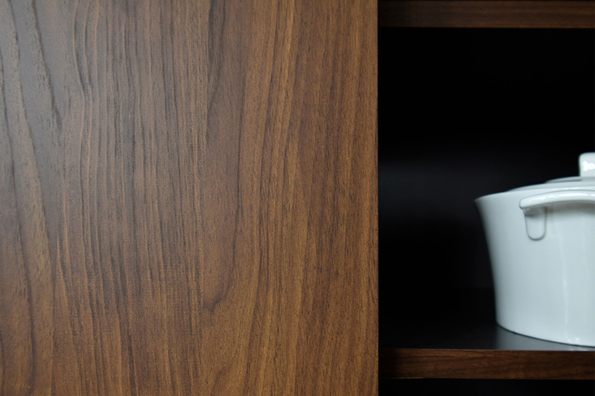 シンプルなフォルムに、モダンな印象のキッチンボードです。ウォールナットカラーの深みと美しい木目柄が、リラックスした落ち着きのある空間を演出します。
