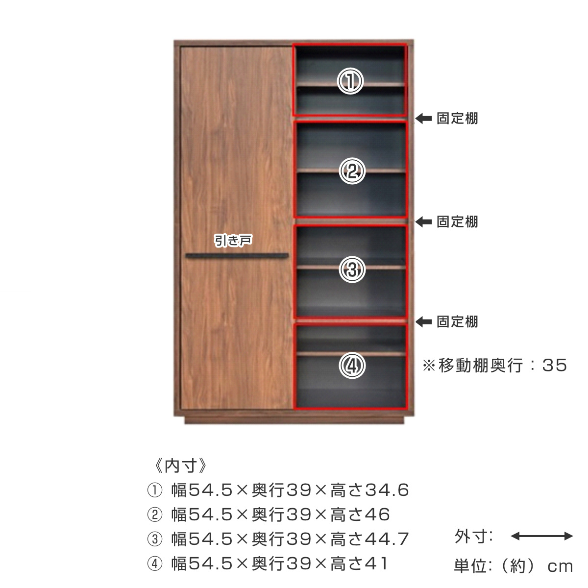引き戸を開けると、固定棚と可動式の棚4枚付きです。高さを自由に調整できるので、食器や調味料など収納物に合わせて整理整頓が可能です。