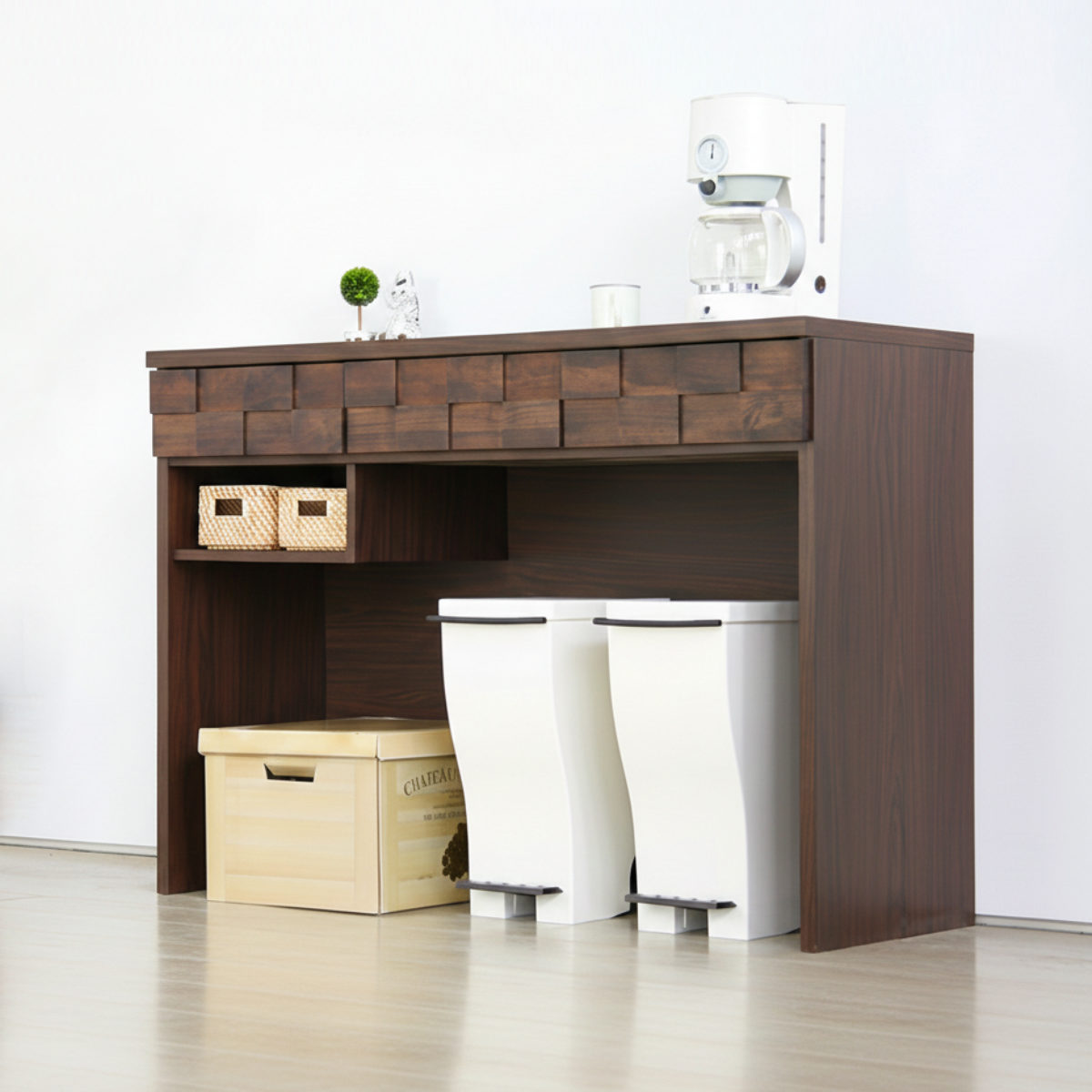 幅119.6cmの、大きめサイズのゴミ箱上ラックです。天板には家電や食器を置いたり、作業台としてもお使いいただけます。オープンスペースにはゴミ箱を収納することができ、キッチンやお部屋がすっきりとした印象に。