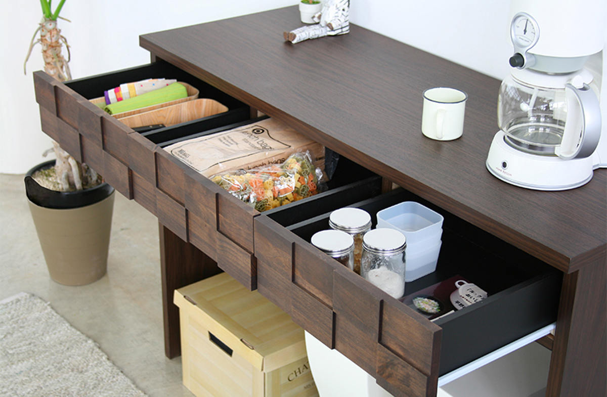 3杯の引出しには、カトラリーやキッチン小物を整理して収納できます。デザイン性のある前板がアクセントです。