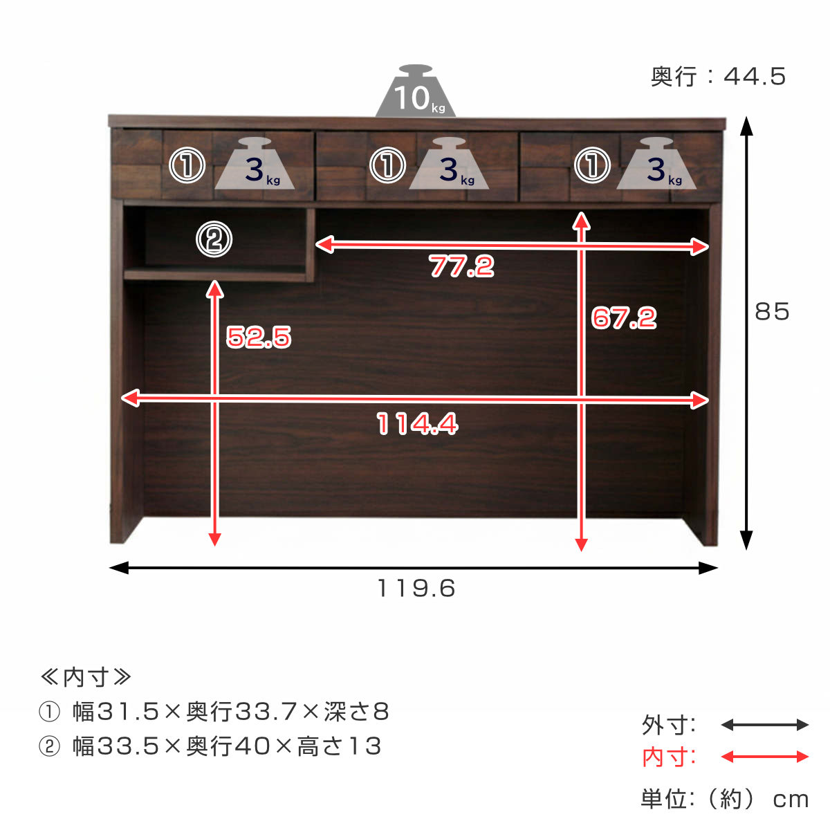| サイズ | 約 幅119.6×奥行44.5×高さ85(cm) |
