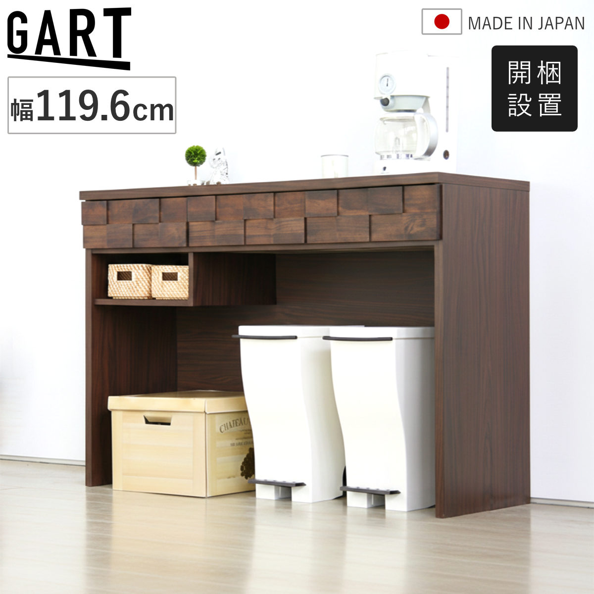 ゴミ箱上ラック 幅119.6cm 木目調 引き出し スライドレール 日本製 完成品 ( 開梱設置 ゴミ箱上 ラック 棚 カウンター 作業台 組み合わせ ゴミ箱収納 家具 キッチン ダストボックス 省スペース 背面化粧 )