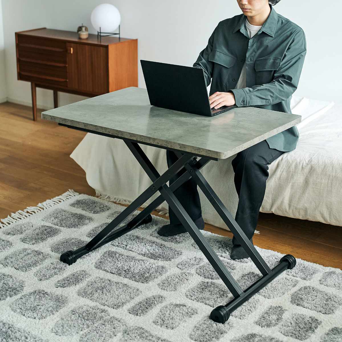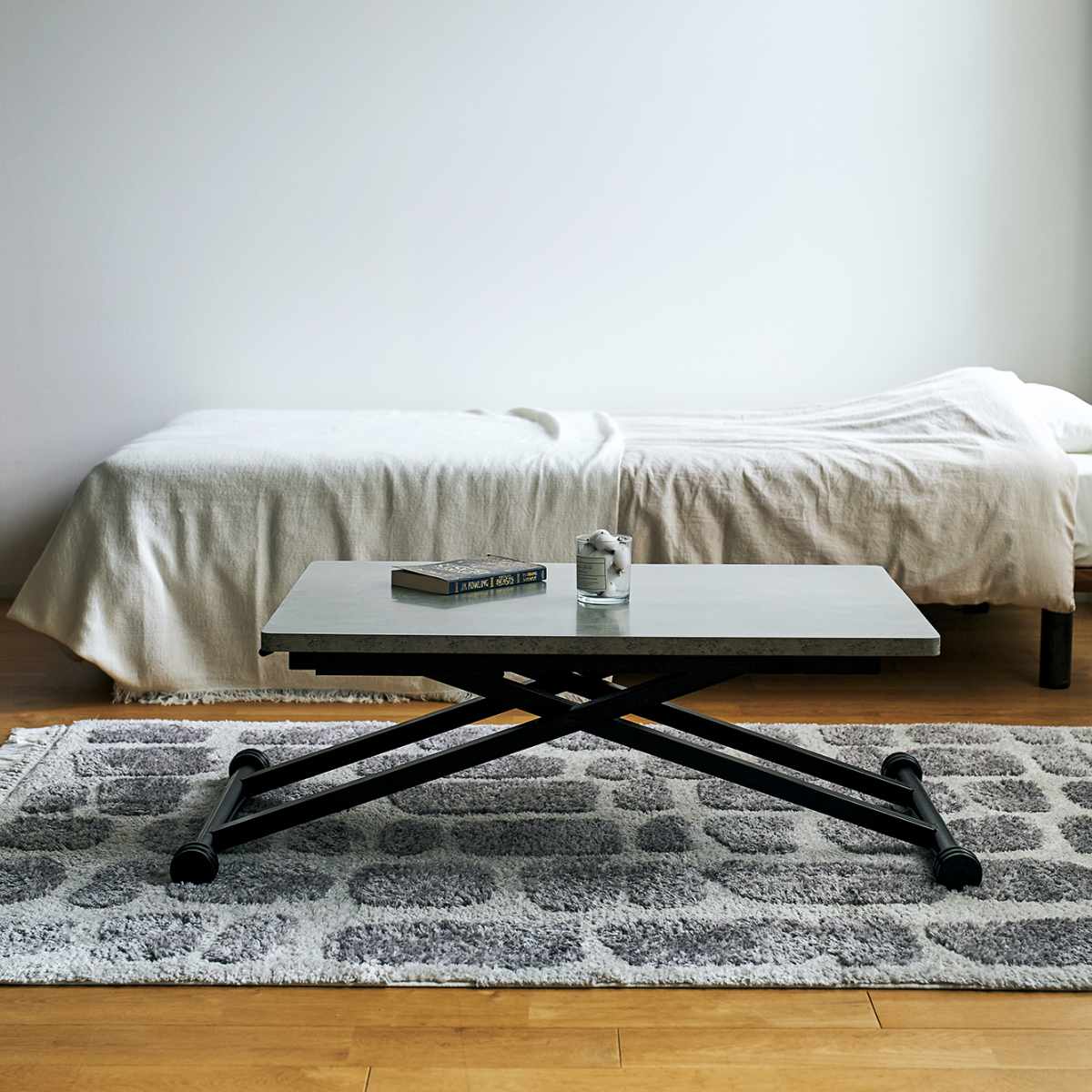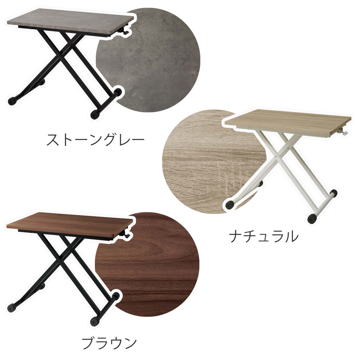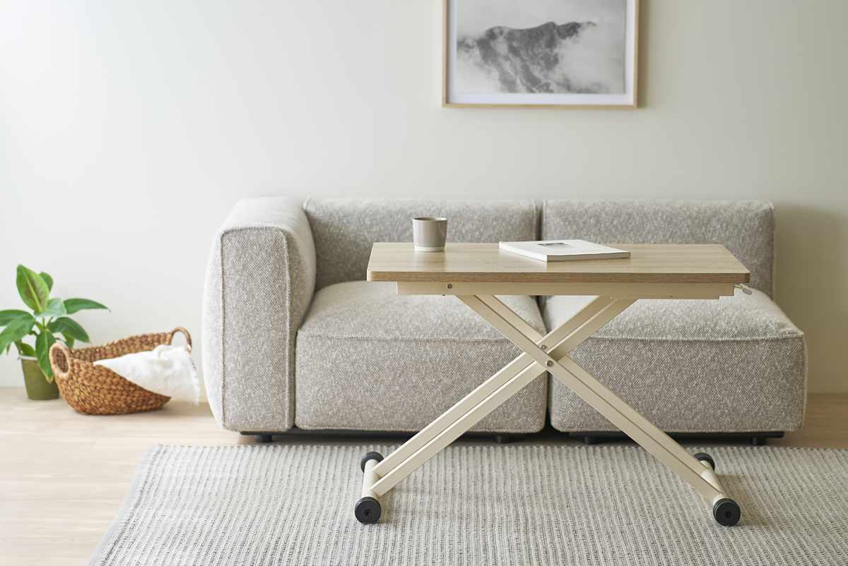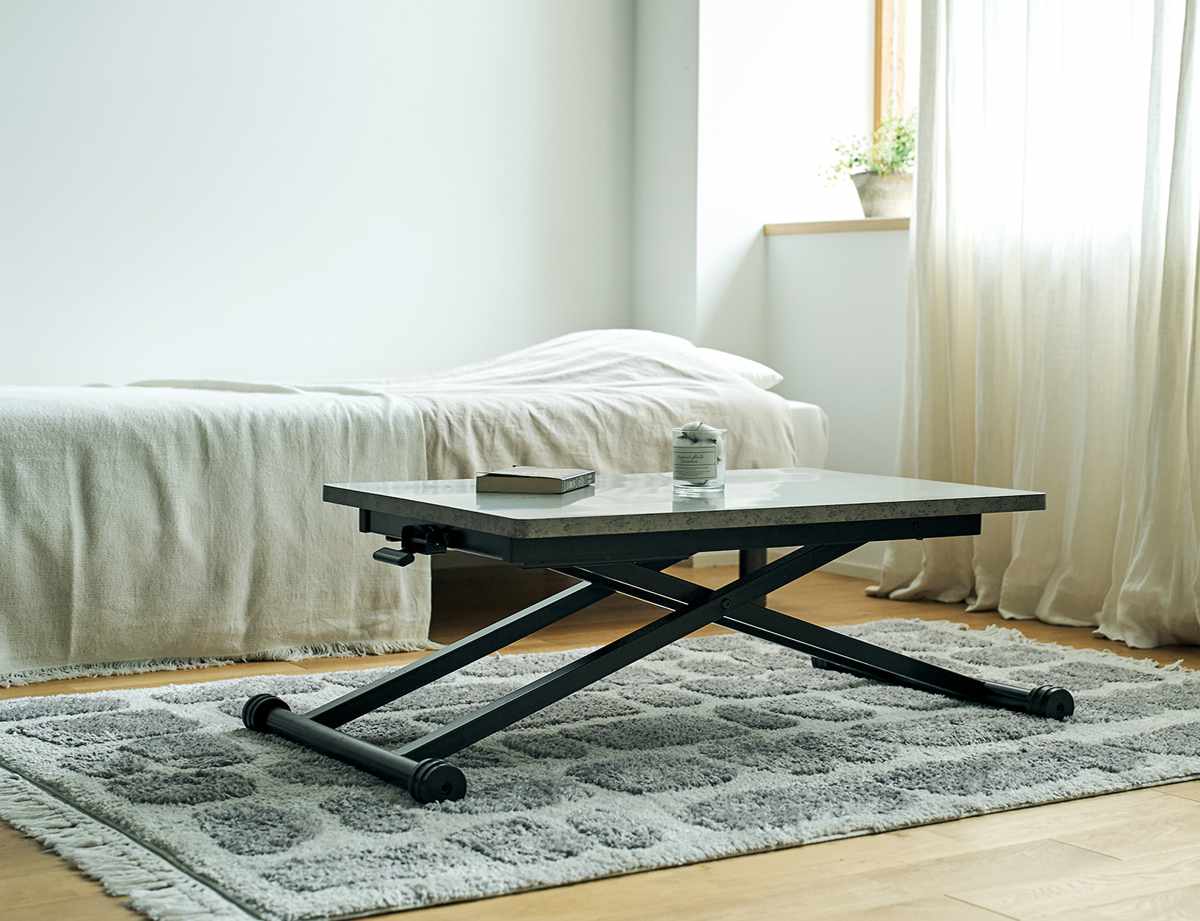 高さを12.5cm~72cmで調節できるリフトテーブルです。ライフスタイルの変化や模様替えにも簡単に対応でき、それぞれで最適な使い方を実現します。お手持ちの家具とも合わせやすい木目柄2色と、スタイリッシュなグレーの石目柄の3色展開です。