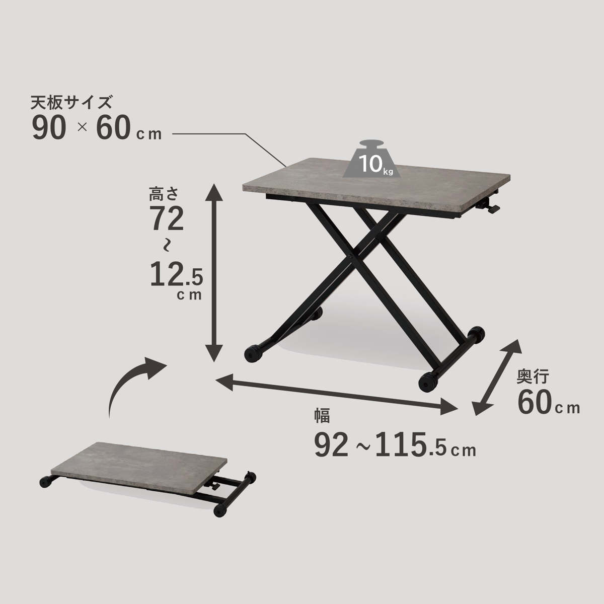 | サイズ | 約 幅92~115.5×奥行60×高さ12.5~72(cm) 天板サイズ:約 幅90×奥行60×厚さ2.5(cm) |