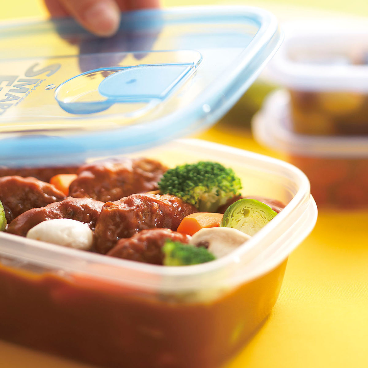 お料理の作り置き保存から電子レンジ加熱までできる、ラップ不要の便利な保存容器です。蒸気を逃がすエアー弁付きで、フタをしたままレンジで加熱調理が可能。さらに、エアー弁が過度な水分蒸発を防ぐので、美味しく調理できます。