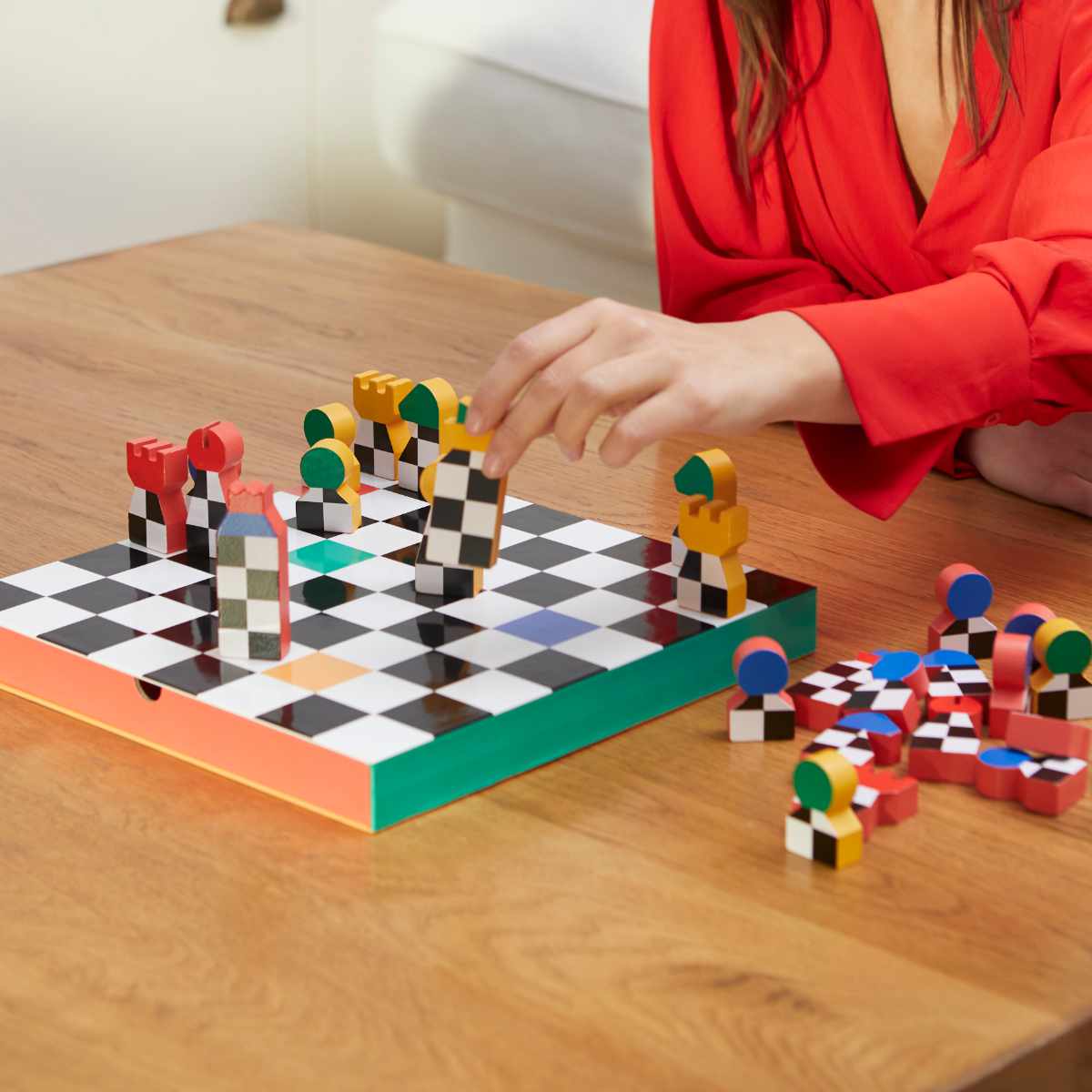 カラフルな駒とユニークなフォルムが目を引く、ポップでモダンなチェスセットです。駒は伝統的な形にとらわれないデザインで遊び心を感じさせながらも洗練された印象に仕上げられています。
