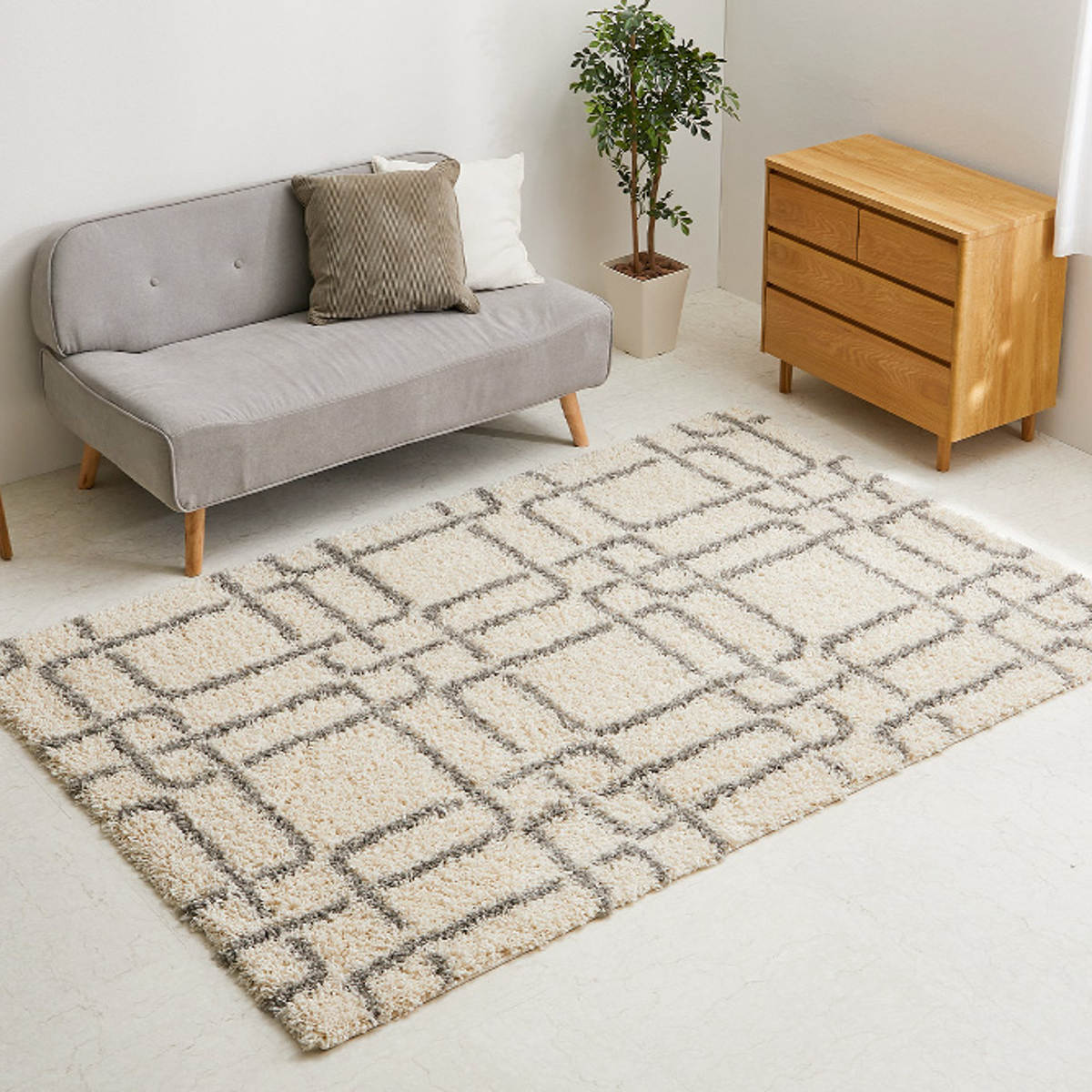 エジプト製のウィルトン織シャギーラグです。おしゃれなモダン柄とナチュラルなカラーでどんなインテリアにも合わせやすいデザインです。しっかりとしたウィルトン織ならではの丈夫さで、長くご愛用いただけます。