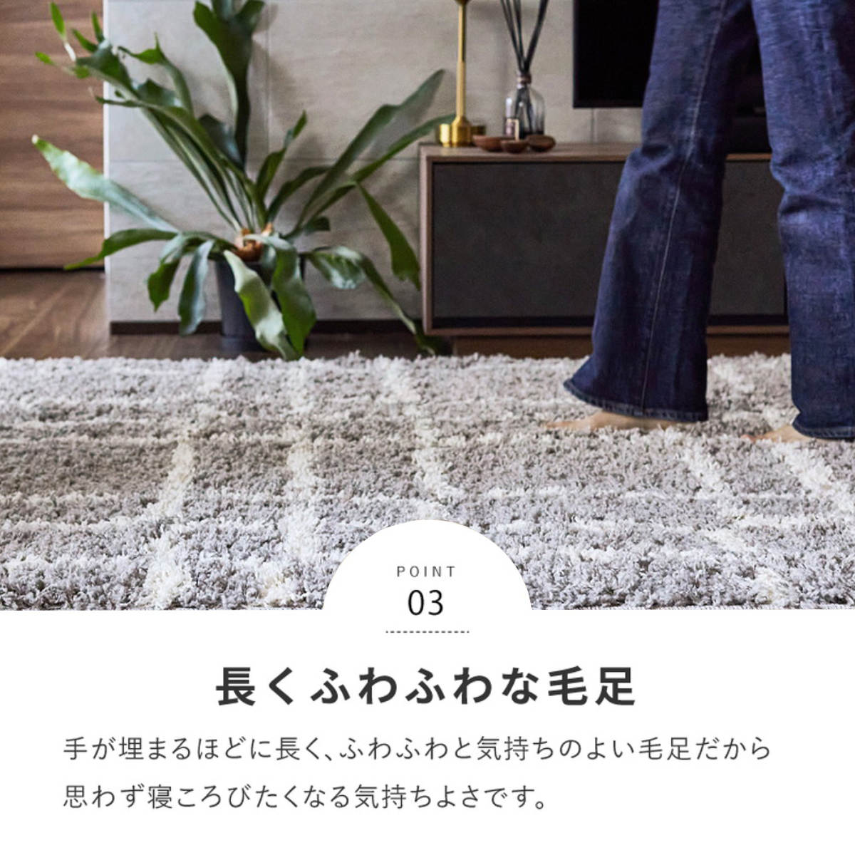 毛足が長くボリュームがあり、おもわず寝転びたくなるような心地良さの、ふわふわとやわらかな肌触り。また、ウィルトンラグはパイルの密度が高く耐久性に優れ、お気に入りのラグを長く使いたい方にもおすすめです。