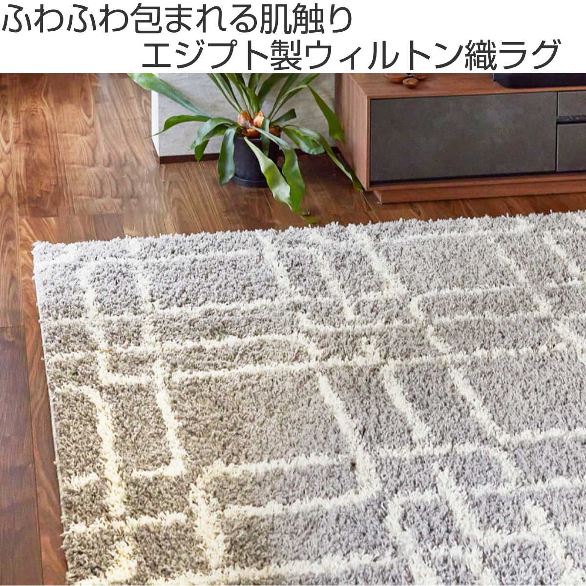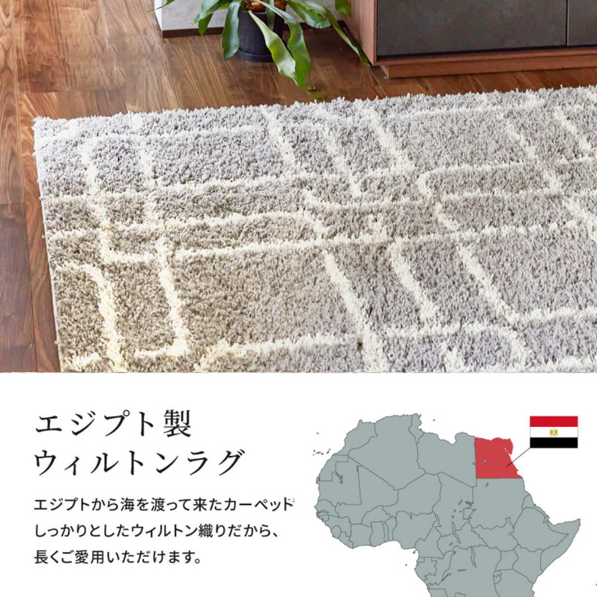 エジプト製のウィルトン織シャギーラグです。おしゃれなモダン柄とナチュラルなカラーでどんなインテリアにも合わせやすいデザインです。しっかりとしたウィルトン織ならではの丈夫さで、長くご愛用いただけます。