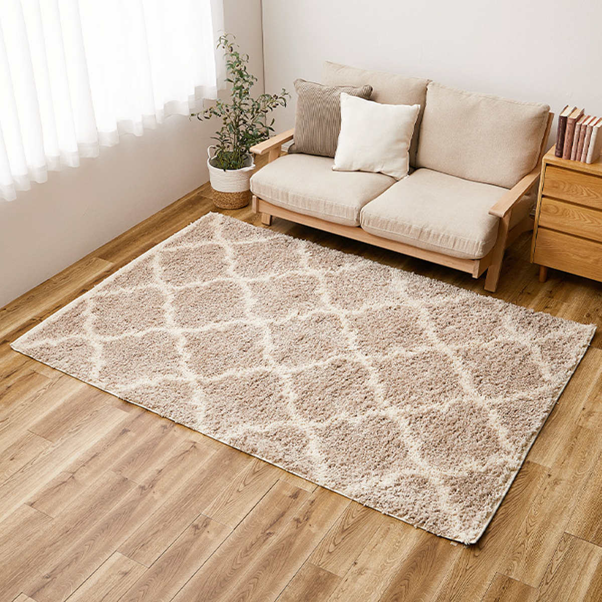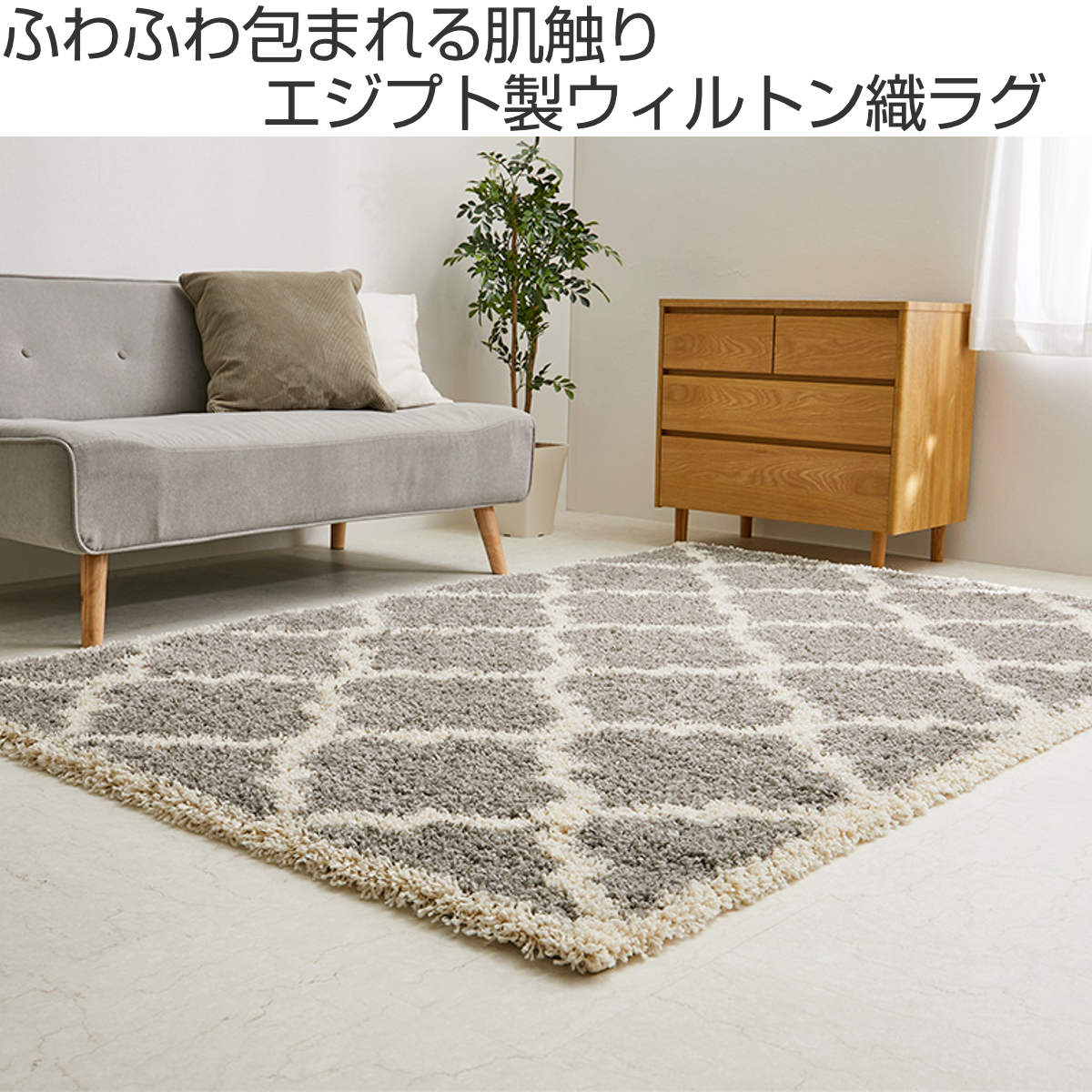 エジプト製のウィルトン織シャギーラグです。おしゃれなモダン柄とナチュラルなカラーでどんなインテリアにも合わせやすいデザインです。しっかりとしたウィルトン織ならではの丈夫さで、長くご愛用いただけます。