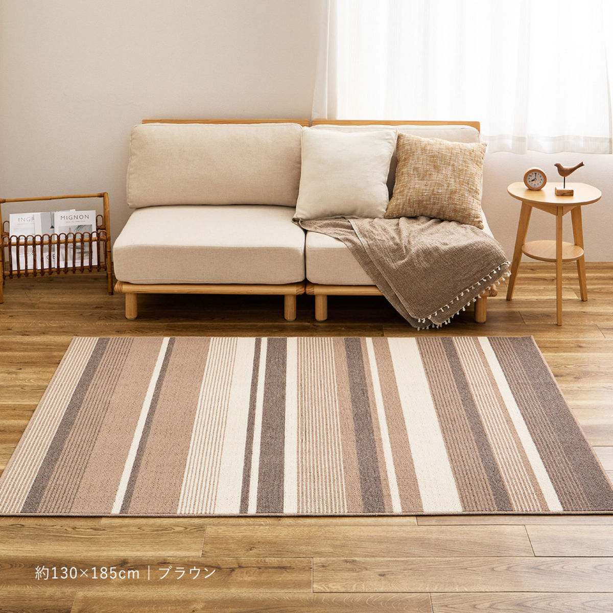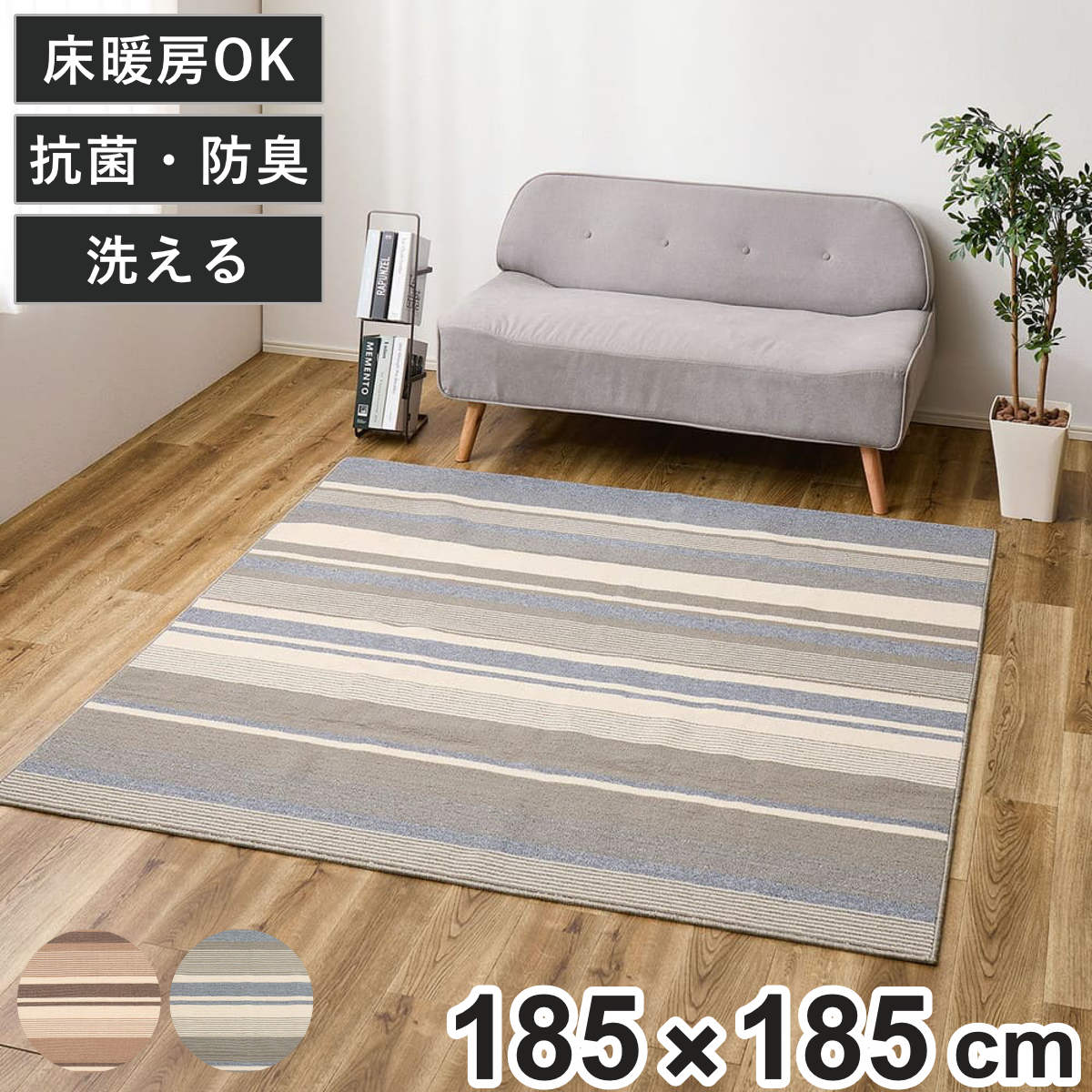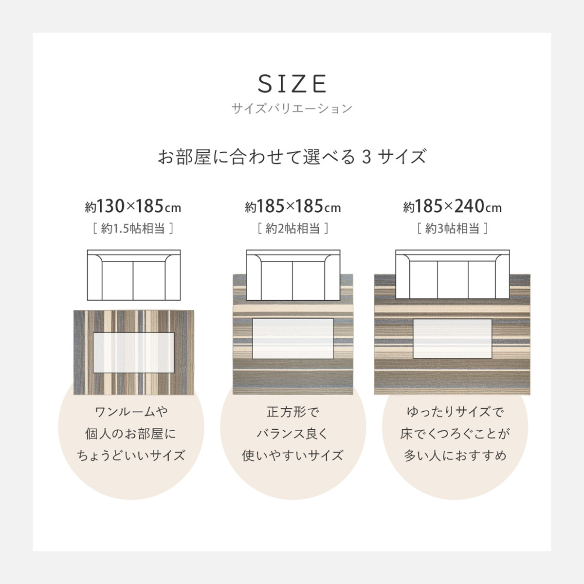 ![]() 130×185cm(二人掛けソファーに使いやすい) | ![]() 185×185cm(センターラグとして使える) | ![]() 185×240cm(のんびりと寝転がって寛げる) 【▲このページの商品】 |