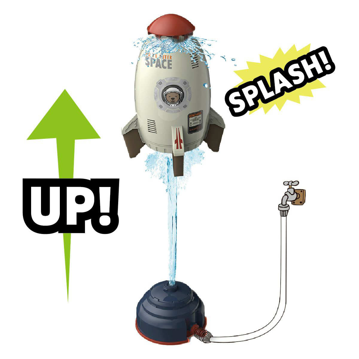 ロケットスプリンクラーは、おうちのホースにつなぐだけで遊べる、電気不要のスプリンクラー型ウォータートイです。水圧の力だけでロケットがふわっと浮き上がる不思議な動き。水圧が強くなるほど、だんだん高さを上げて空中でスピン!見ているだけでも楽しく、思わず声が出てしまいます。