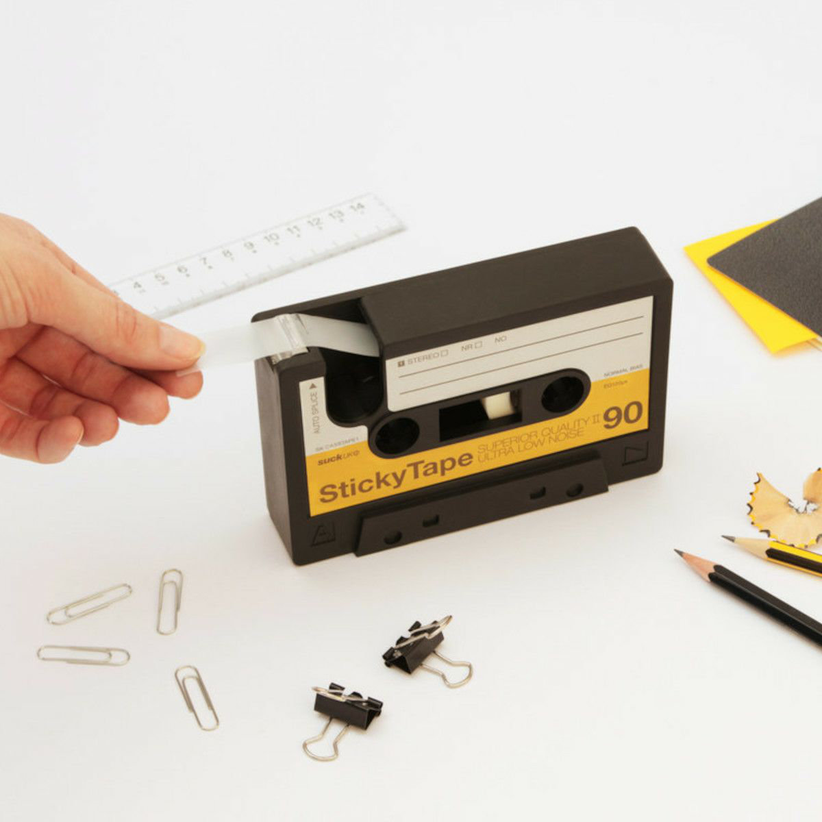 まるで本物のカセットテープのような見た目から、実際にテープがスーッと引き出せるユニークなデザイン。思わず使いたくなる、遊び心たっぷりのテープディスペンサーです。