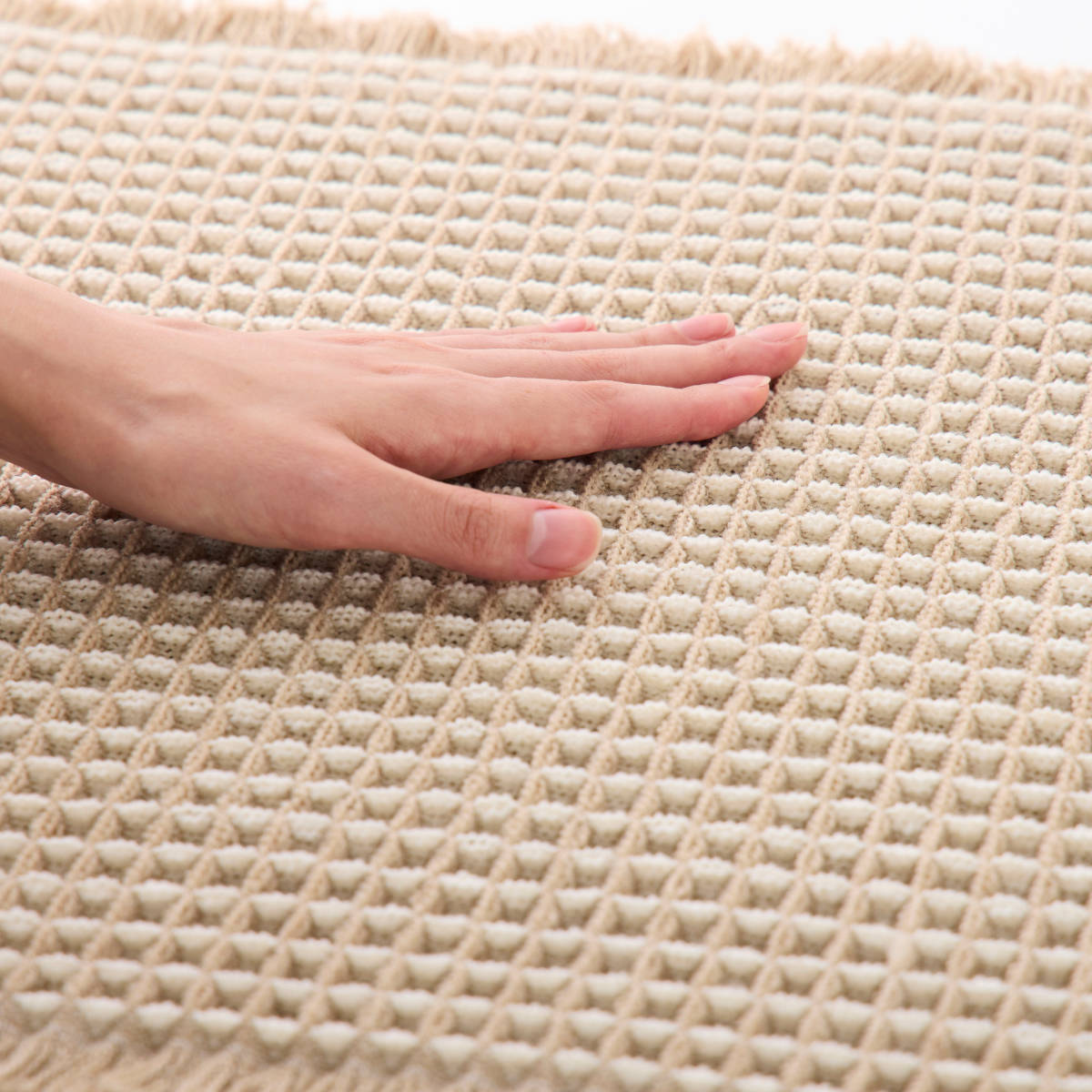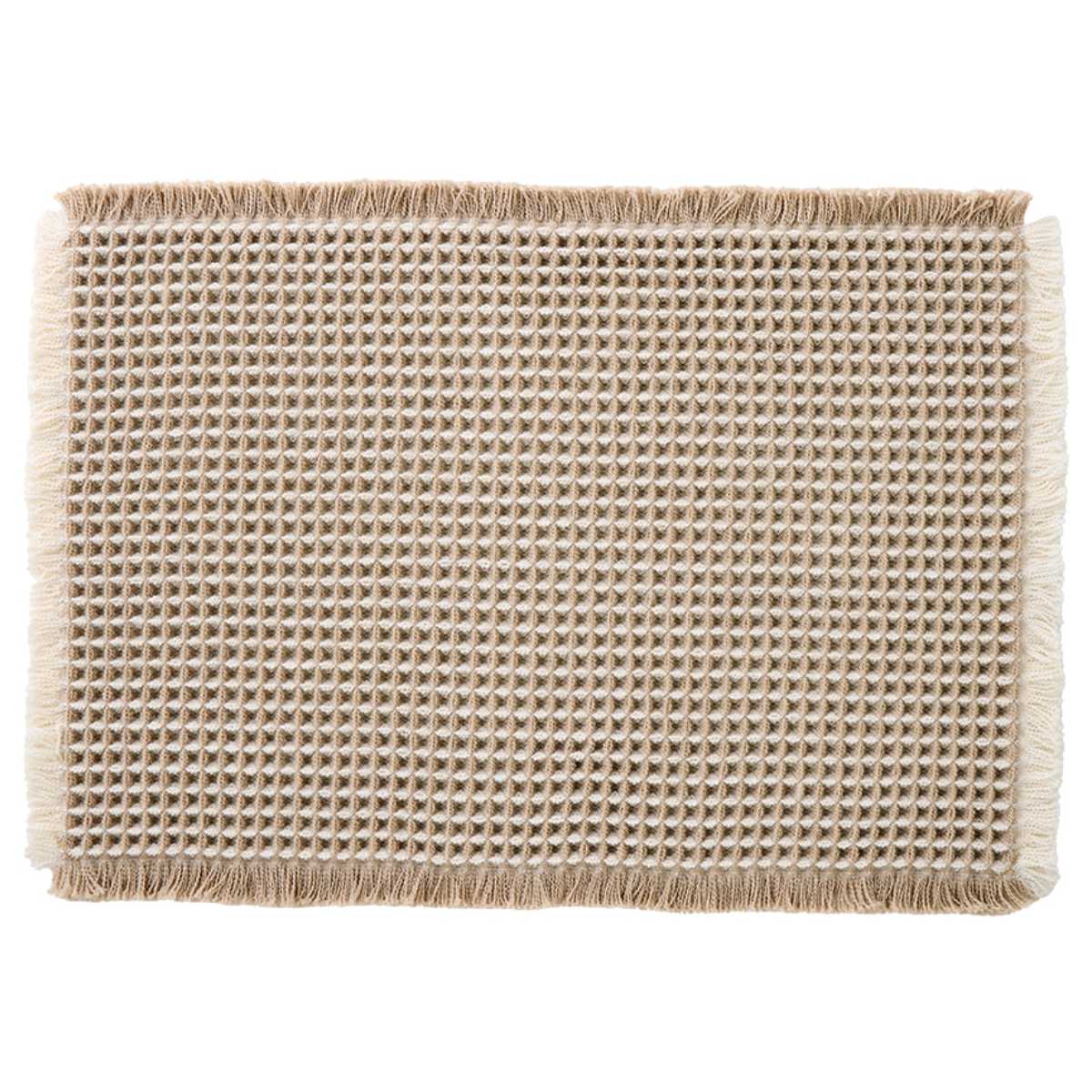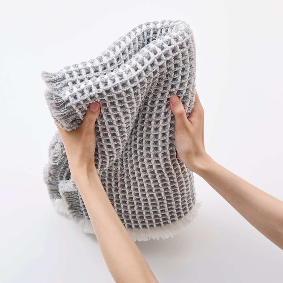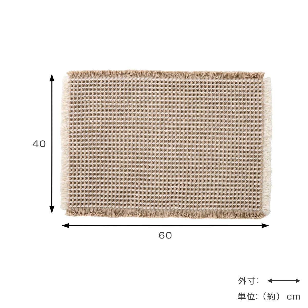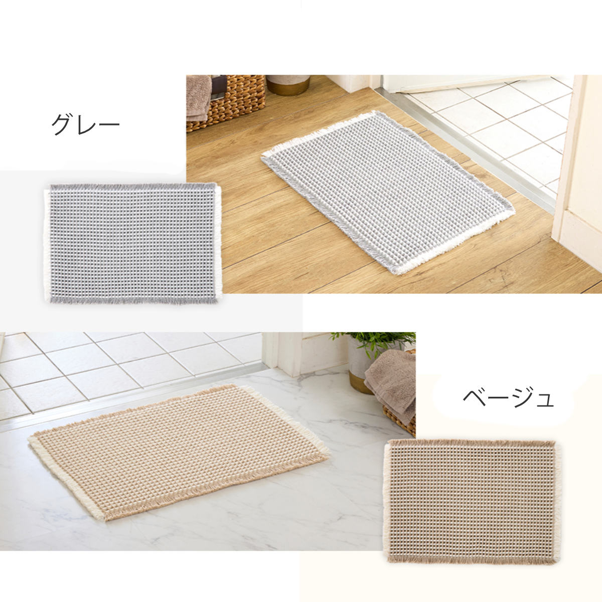 凹凸のあるワッフル織りが特徴的なバスマット(40×60cm)です。立体構造で水滴をすばやく吸収し、足元がサラッと快適。一般的な定番のサイズで使いやすいです。