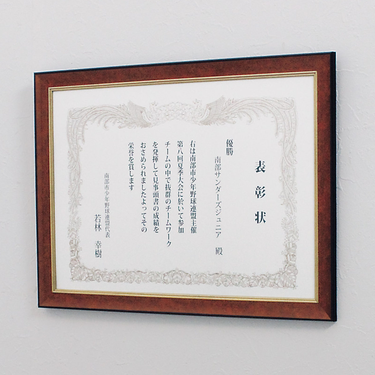 賞状・証書・免状におすすめの賞状額です。高級感のある洗練されたデザインで、大切な受賞の証をより一層引き立て、空間に格調高い印象を与えます。軽量ながらしっかりとした作りで、長く美しく飾っていただけます。