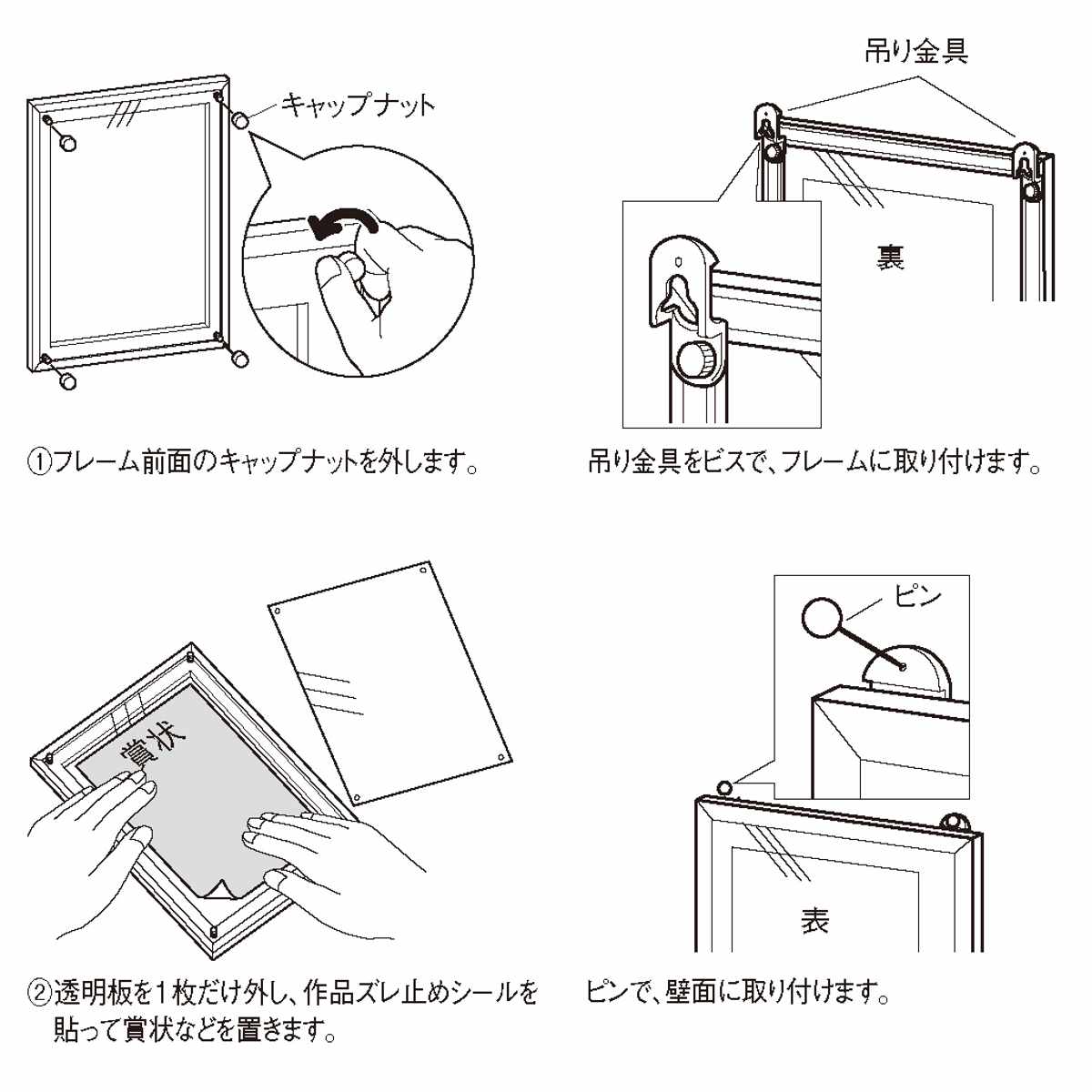●付属のピンと留め具で工具不要の簡単取り付けができます。