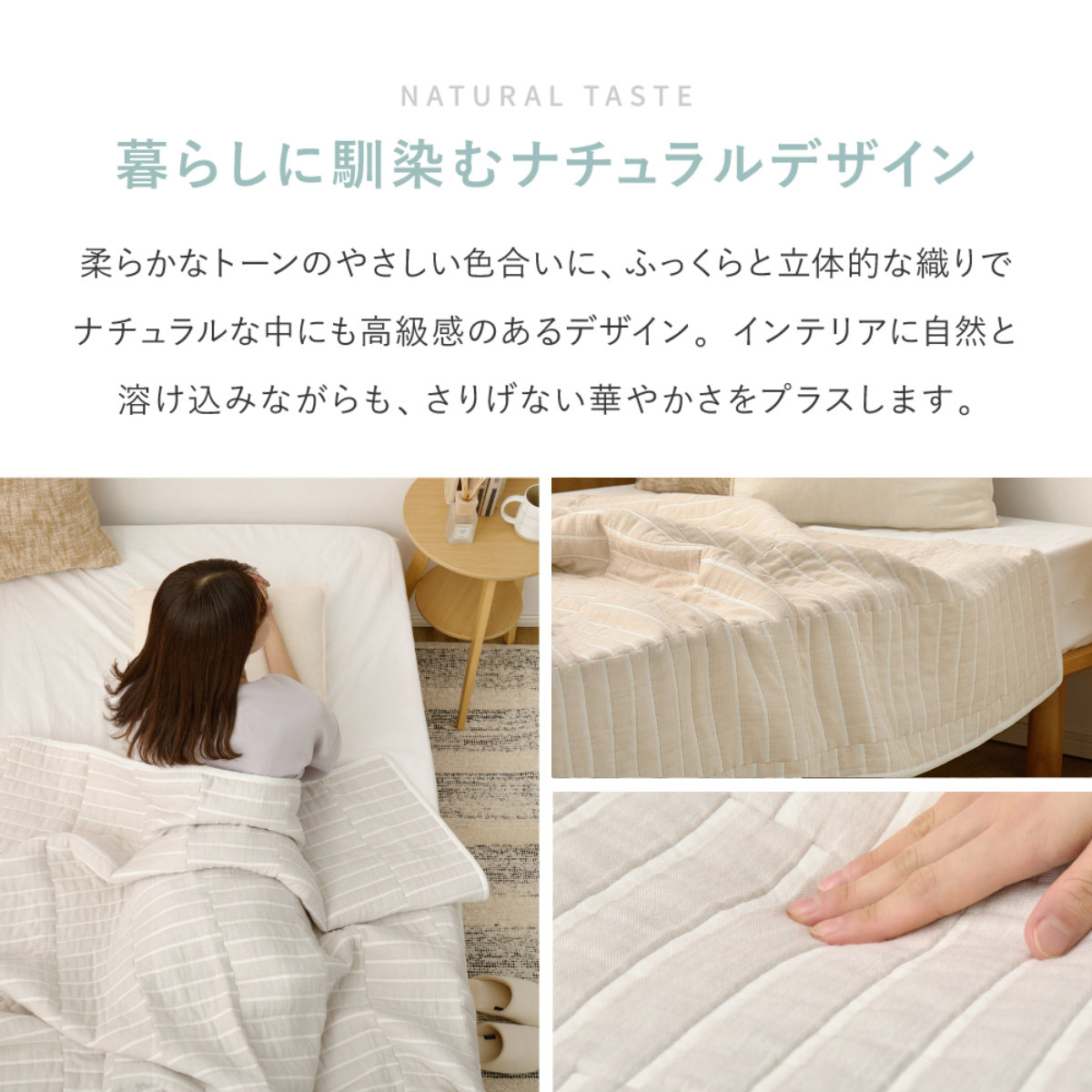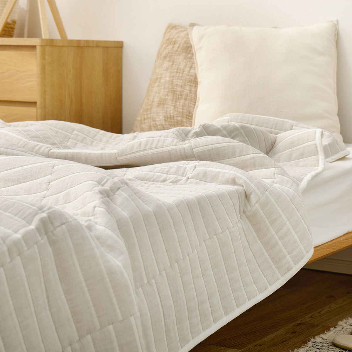 ご家庭で気軽に丸洗いができ、いつでも清潔にお使いいただけます。使い続けるほどにやわらかさが増し、肌に馴染んでいくのも魅力です。毎日の暮らしに寄り添いながら、長く快適にご使用いただけます。