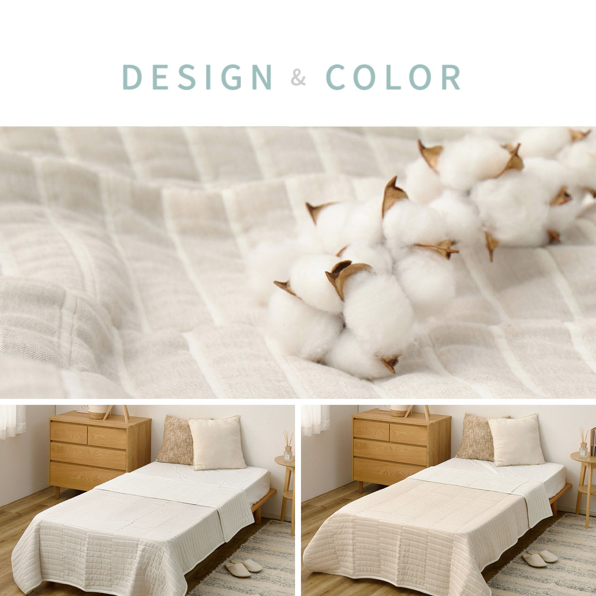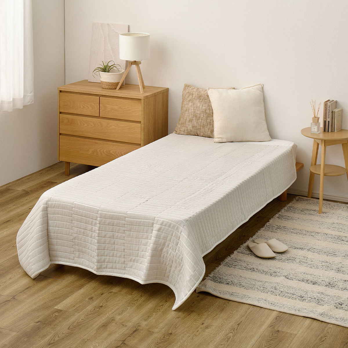 通気性とほどよい保温性を兼ね備えたコットン素材を使用しており、春夏はさらっと涼しく、秋冬はやさしいぬくもりを感じられます。寝室だけでなく、リビングでのくつろぎ時間にも活躍します。