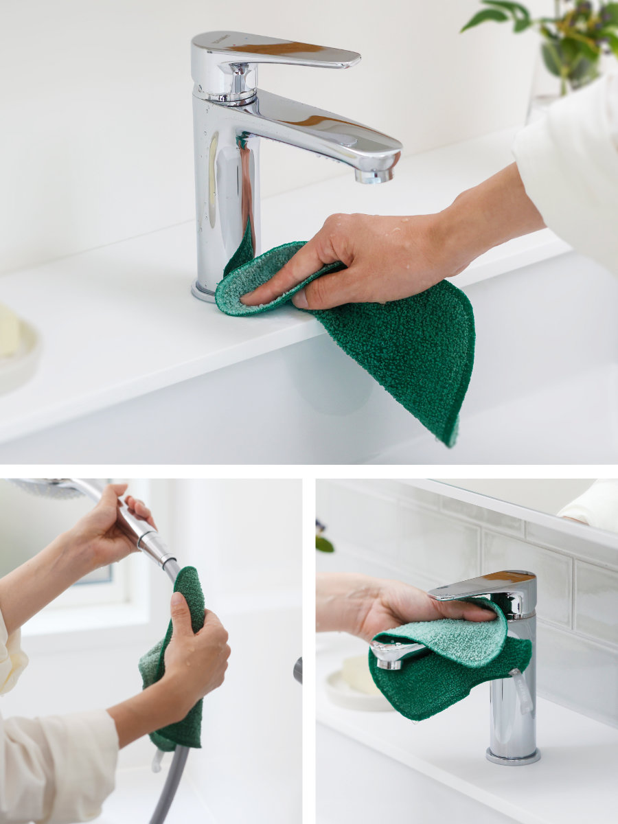 洗面台の水アカや鏡のくもり、浴室の浴槽や床のヌメリ、キッチンのシンクや蛇口の汚れなど、家中の水周りで手軽に使えます。
