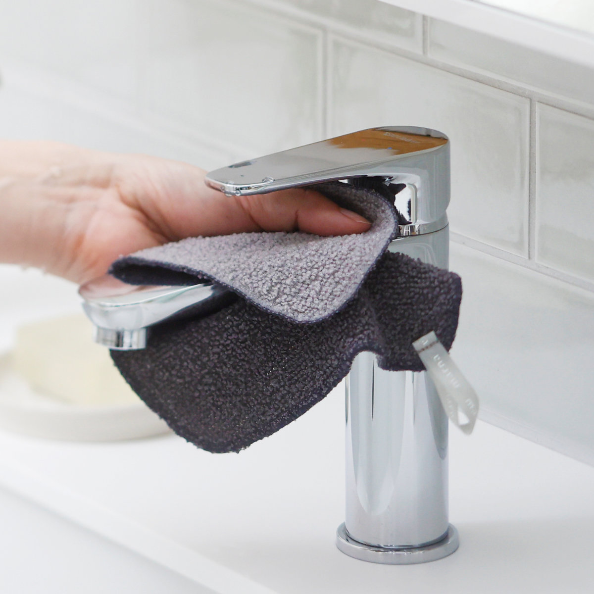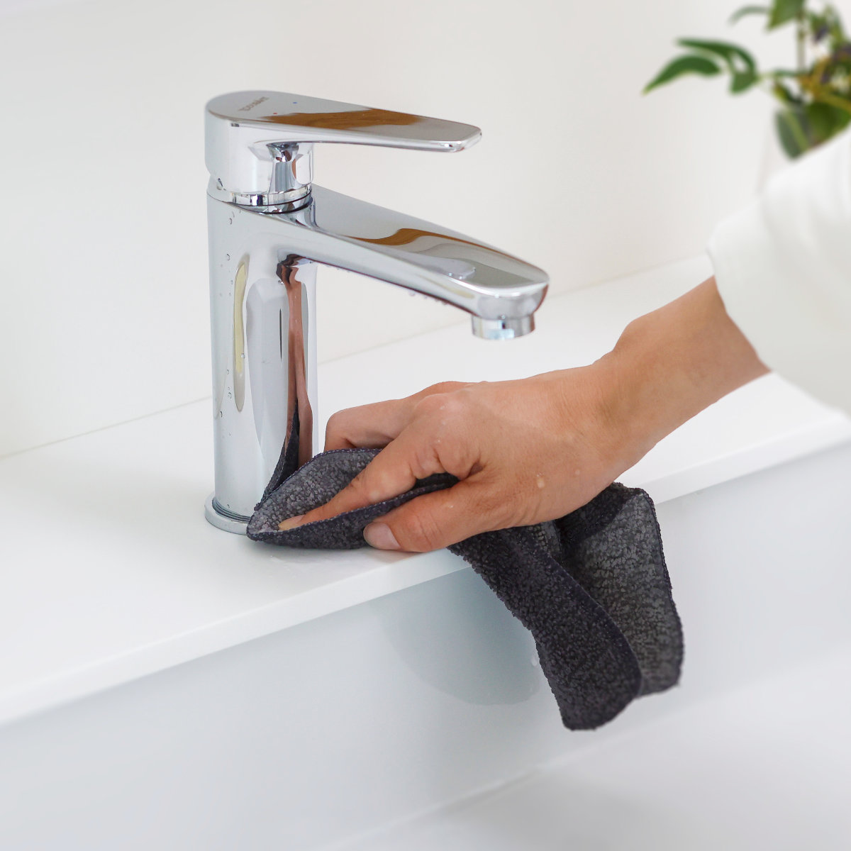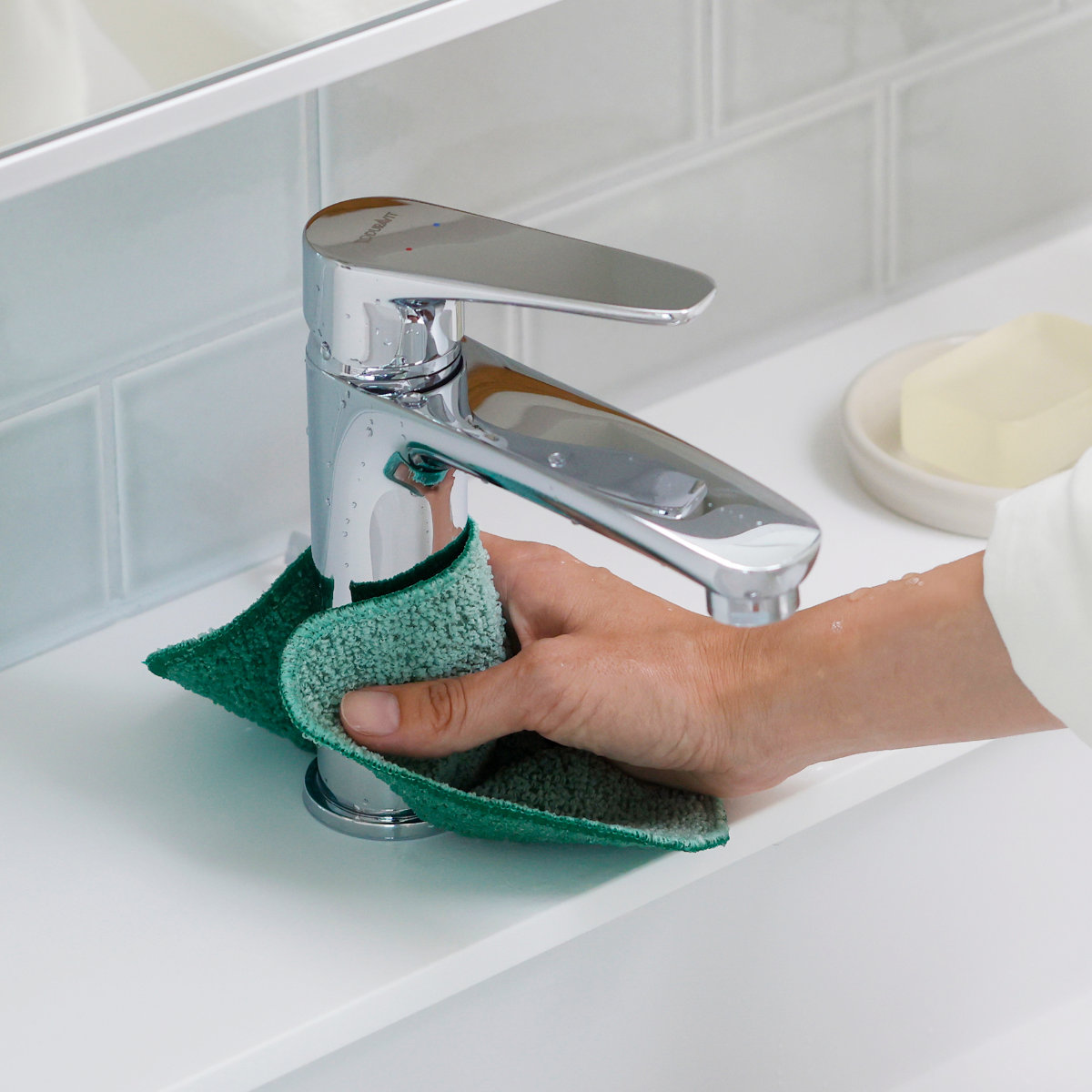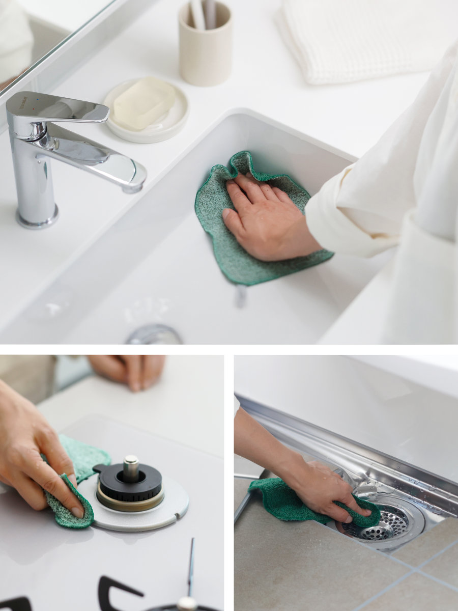 水に濡らすことでゴリゴリとしたコシのある質感になり、弾力を活かして汚れをしっかりとかき落とします。蛇口の水アカもスッキリ落とせます。