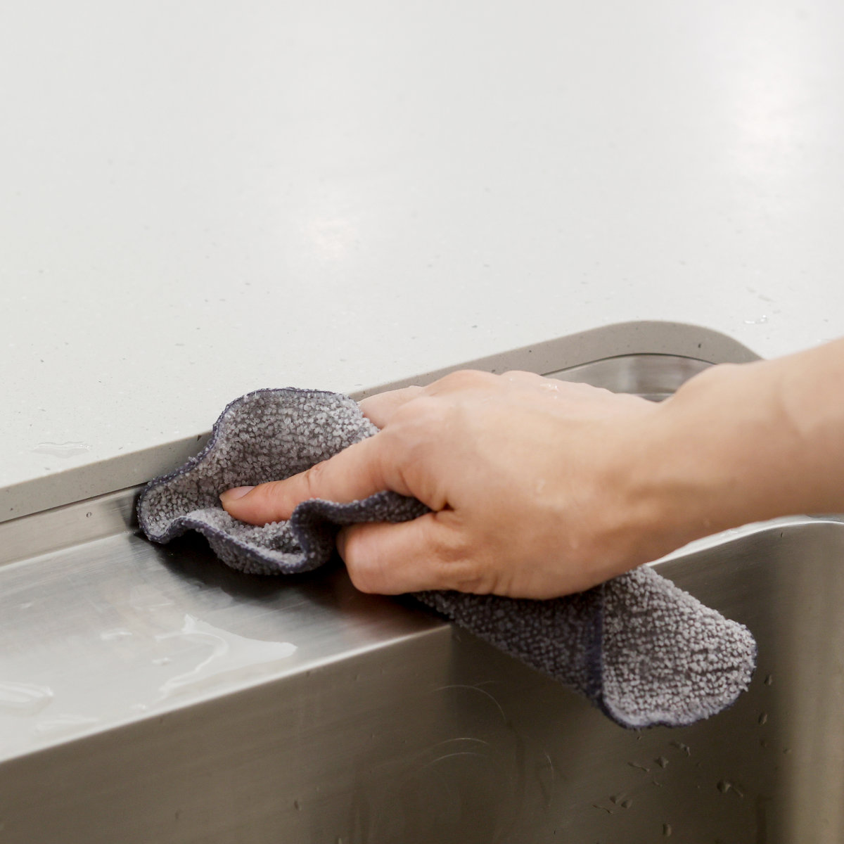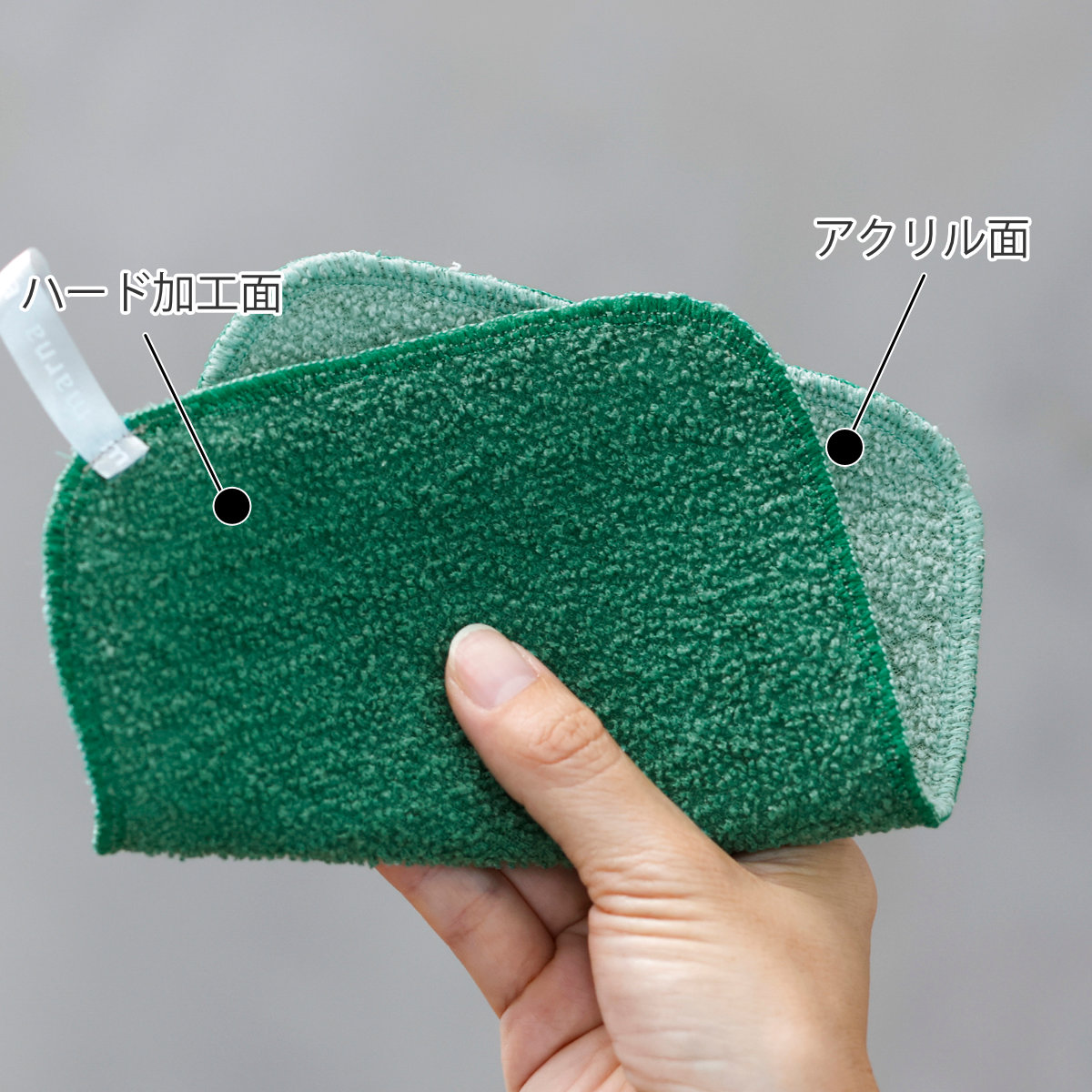 水ピカの生地は不均一な凹凸で汚れをかき取りやすい「ランダムパイル」仕様で、濃いカラーの「ハード加工面」と淡いカラーの「アクリル面」を使い分ければ、しつこい汚れも傷が気になる汚れもこれ1つで完結します。