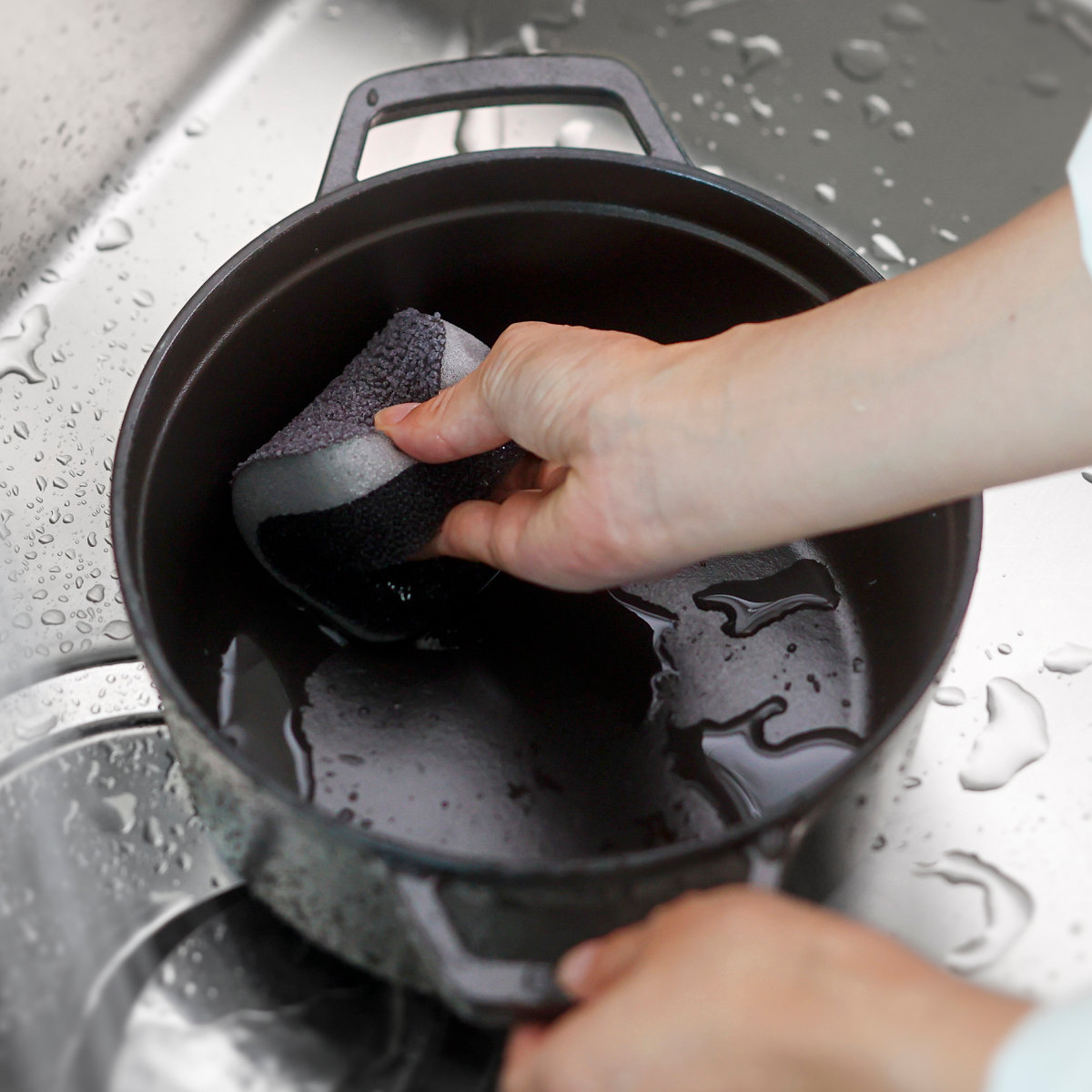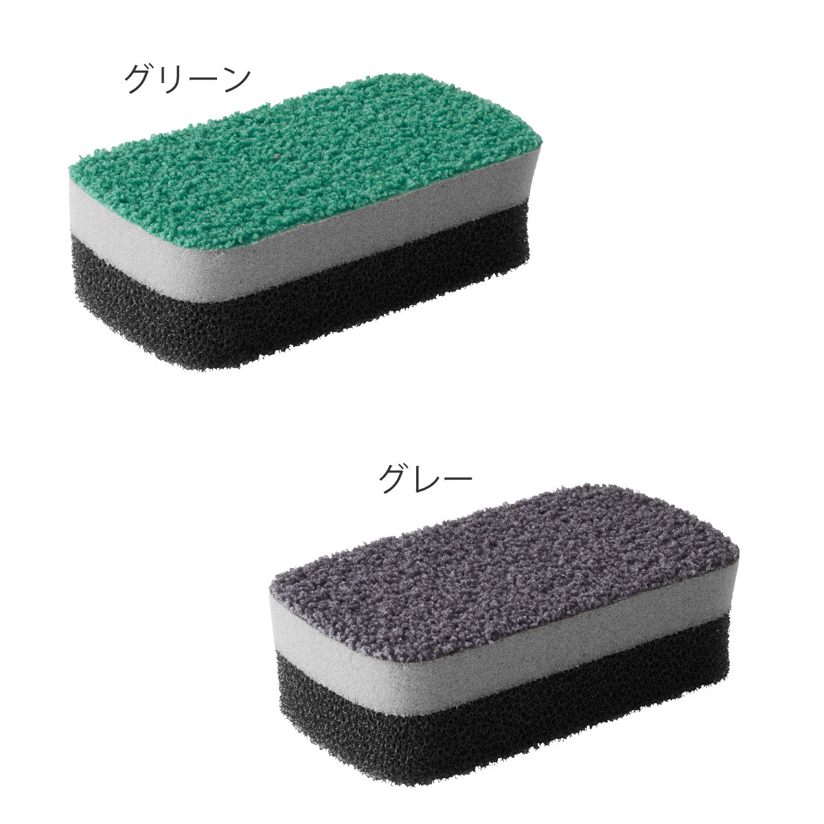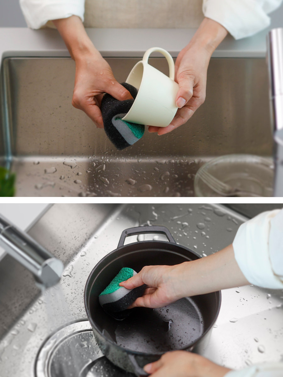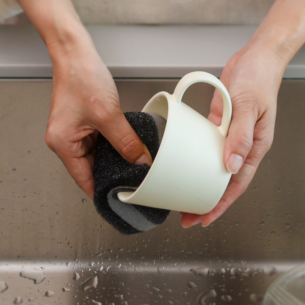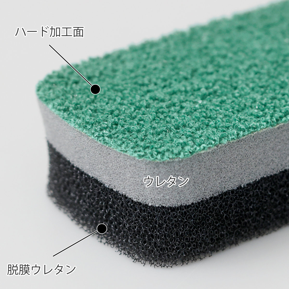 濃いカラーの「ハード加工面」と、目の粗い「脱膜ウレタン」の使い分けで、しつこい汚れも傷付きが気になる食器についた汚れも、1つで洗い物が完結します。間に目の細かいウレタンがあることで、洗剤をつけても泡持ちよく使えます。