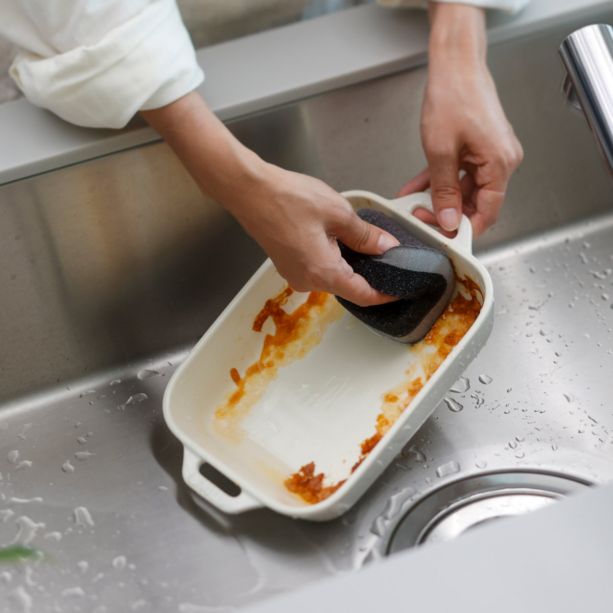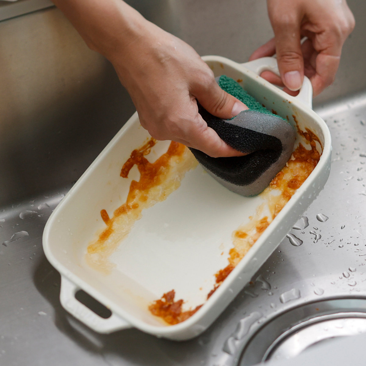 水を含ませるとゴリゴリとしたコシのある質感になり、汚れをかき出すようにしっかり落とします。マグカップの茶渋や、グラタン皿にこびりついた汚れもすっきりきれいに仕上げます。